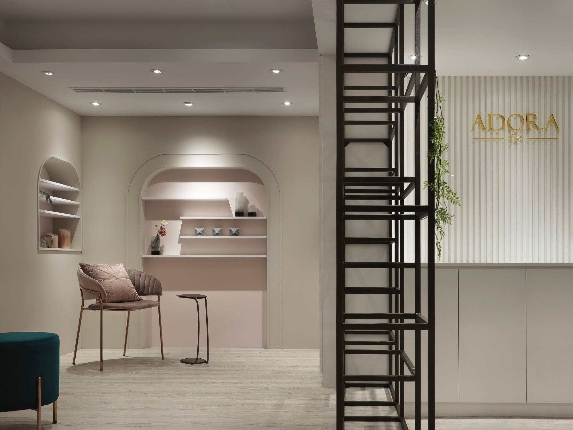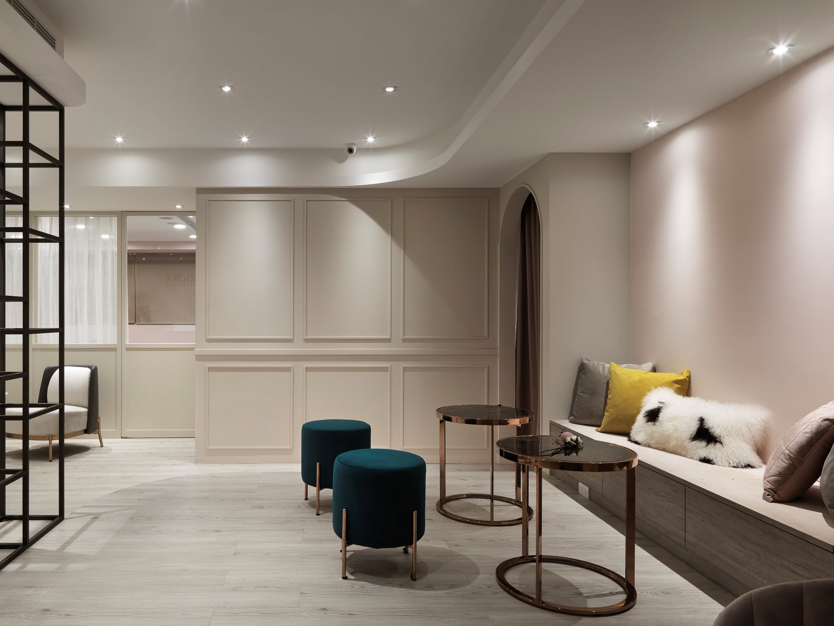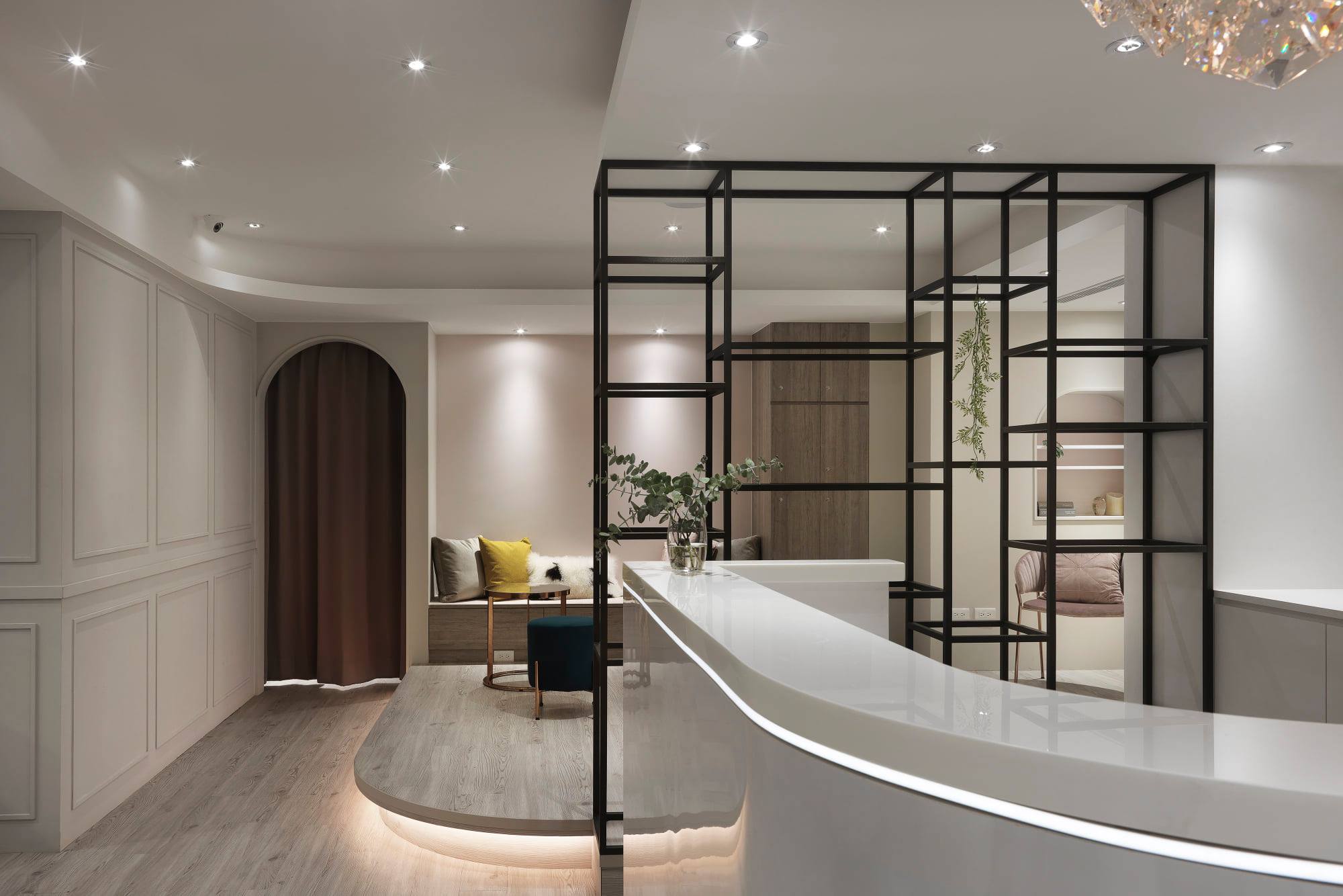 給予靜逸、沉澱的空間姿態同時直覺地感受到整個氛圍所能帶給她的愉悅感,獨特的設計元素能讓它散發獨特的氣質,這種與眾不同往往能增加會所的附加價值,入門迎賓處藉由大理石吧檯、現代刻痕牆面、搭配客製化不規則烤漆鐵件,兼顧空間感與機能性