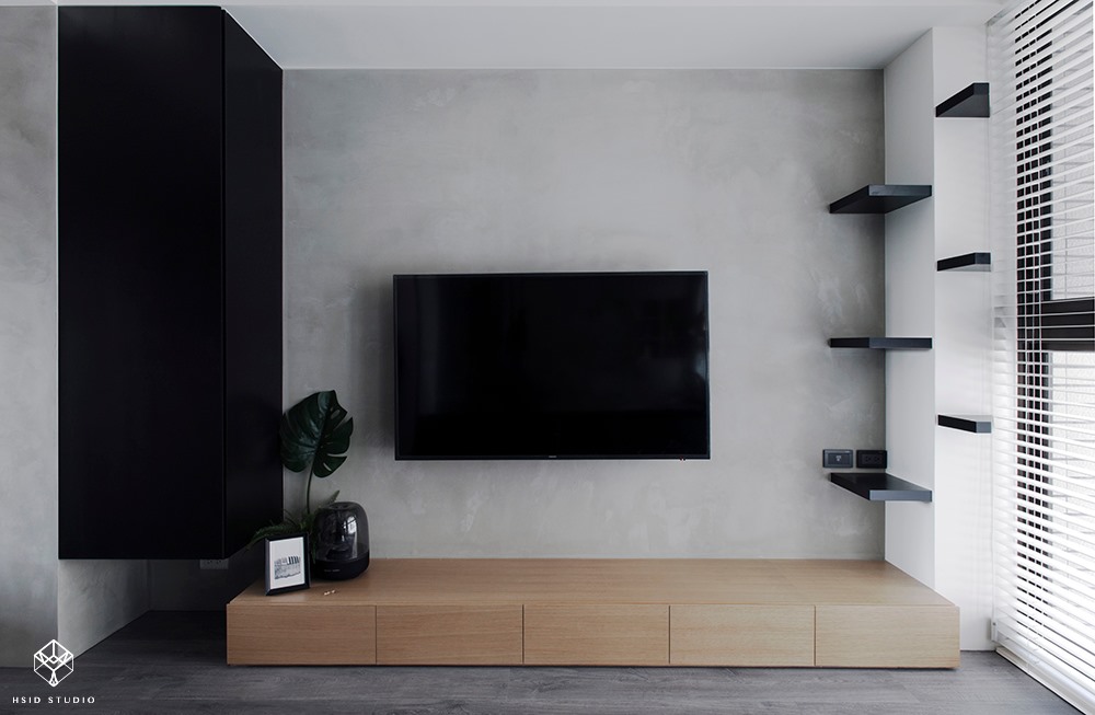 現代輕工業風格,黑灰白做為空間主調,搭配溫暖木質,賦予空間特性和安靜,客廳電視牆以仿清水模塗料為底,右側靠窗處以木作烤漆貓跳板,提供貓咪一個玩樂的舞台,形塑現代卻不失溫度的品味居所,呈現屋主對藝術美感及生活品質的追求。