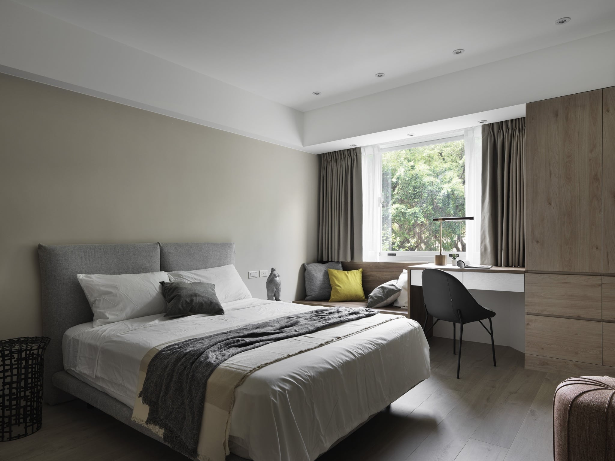 臥室區塊以淺色搭配溫潤木質感,帶出質樸簡約的基調,淺灰色符合沉靜的睡眠空間,融合日式家具的點綴,在結束一天的忙碌奔波後,你洗盡疲憊,慵懶地躺在床上,單一淺色系溫和感的空間,更有生活感。