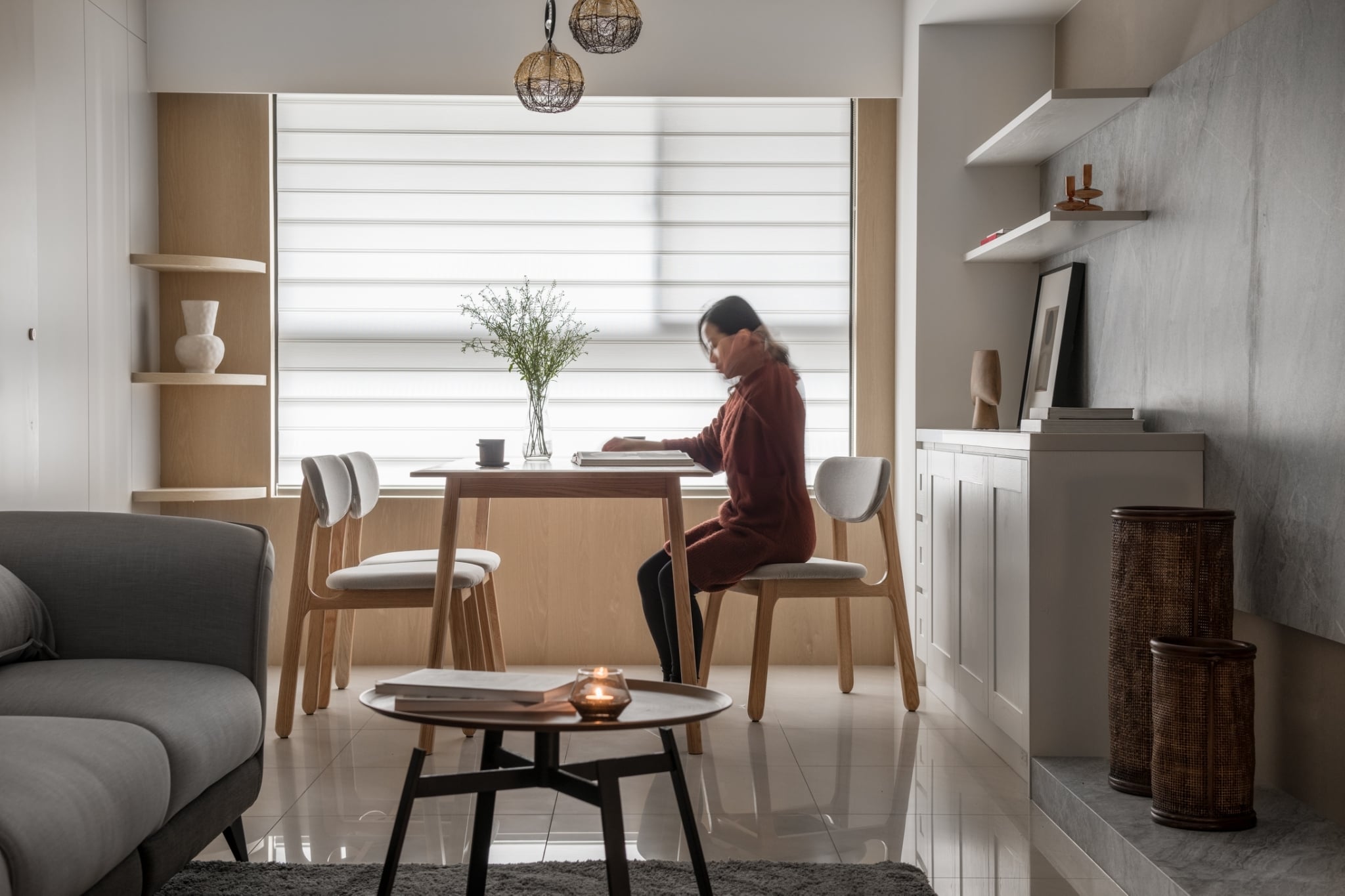 屋主因為是退休夫妻,希望在生活品質上面首重居家安全,偏好暖木調搭配灰色系,在公共空間的規劃上保持開放是設計,格局之間的走道寬度盡量符合人體工學一體成形,隨著年齡增長,睡眠時間也會逐漸縮短,能讓房子保持光線充足,在空氣流通下,能讓身體保持在健康的狀態。