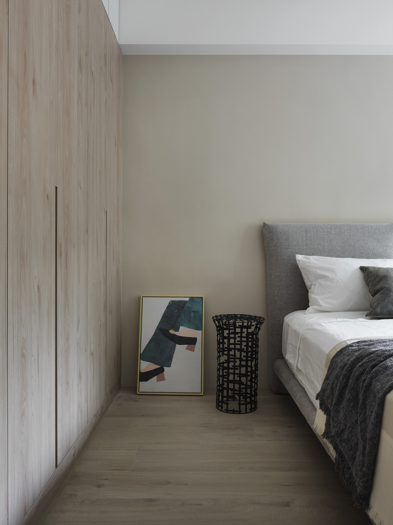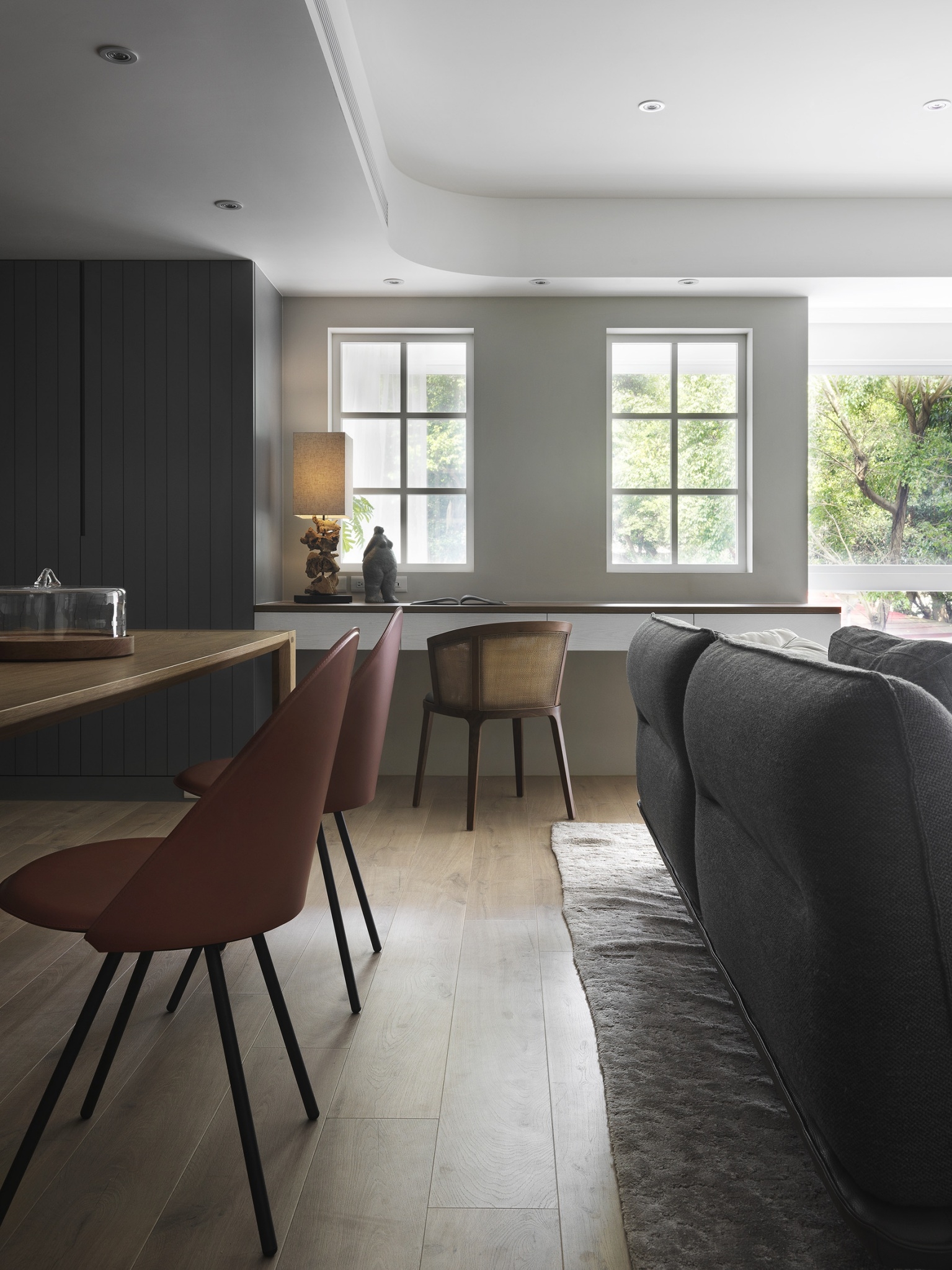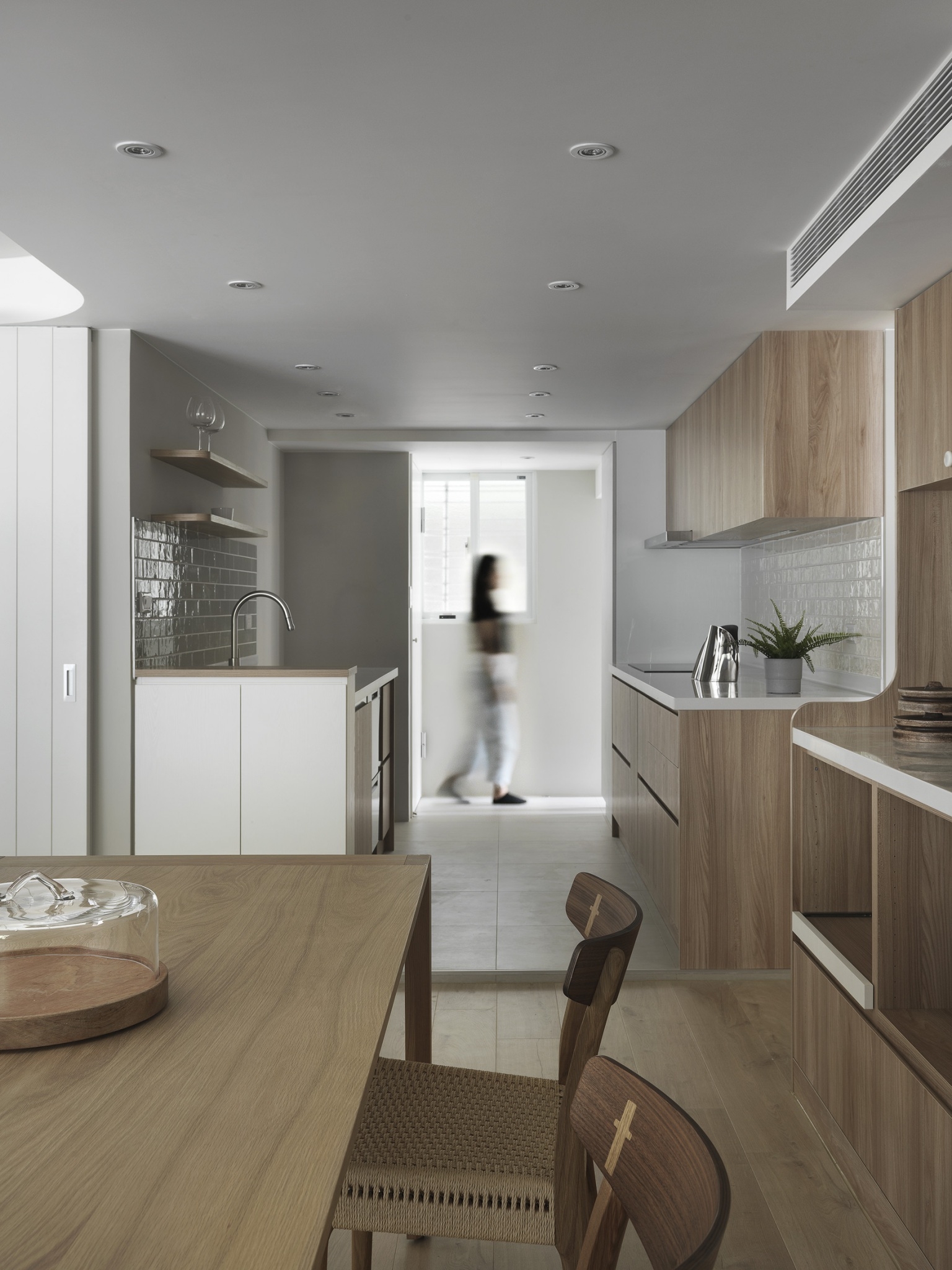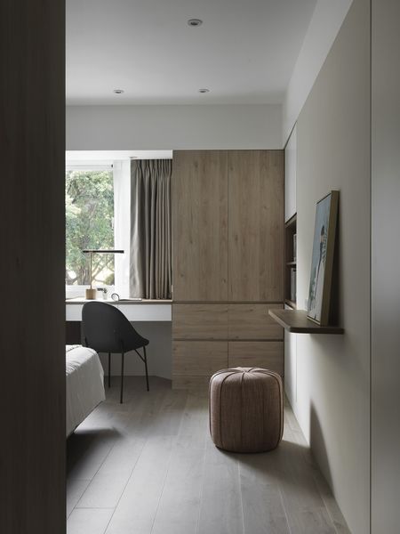 30 年老公寓進行翻新,幅度挪移格局,以無印風清爽畫面伸展了公空間與窗面比例,追求開闊明亮的空間感,減少走道虛坪,使原本狹長不規則的公共領域,轉變為方正,並將大面採光窗延伸入內,藉光線重新改變空間風貌。詮釋簡約風精神,少即是多的裝修風格,搭配自然取向的淺色木紋色系櫃體,使色溫讓空間不覺得壓迫,運用白色釋放坪數壓力,局部加上跳色、線板與磁磚拼貼劃分客餐廚,添增溫暖典雅層次。