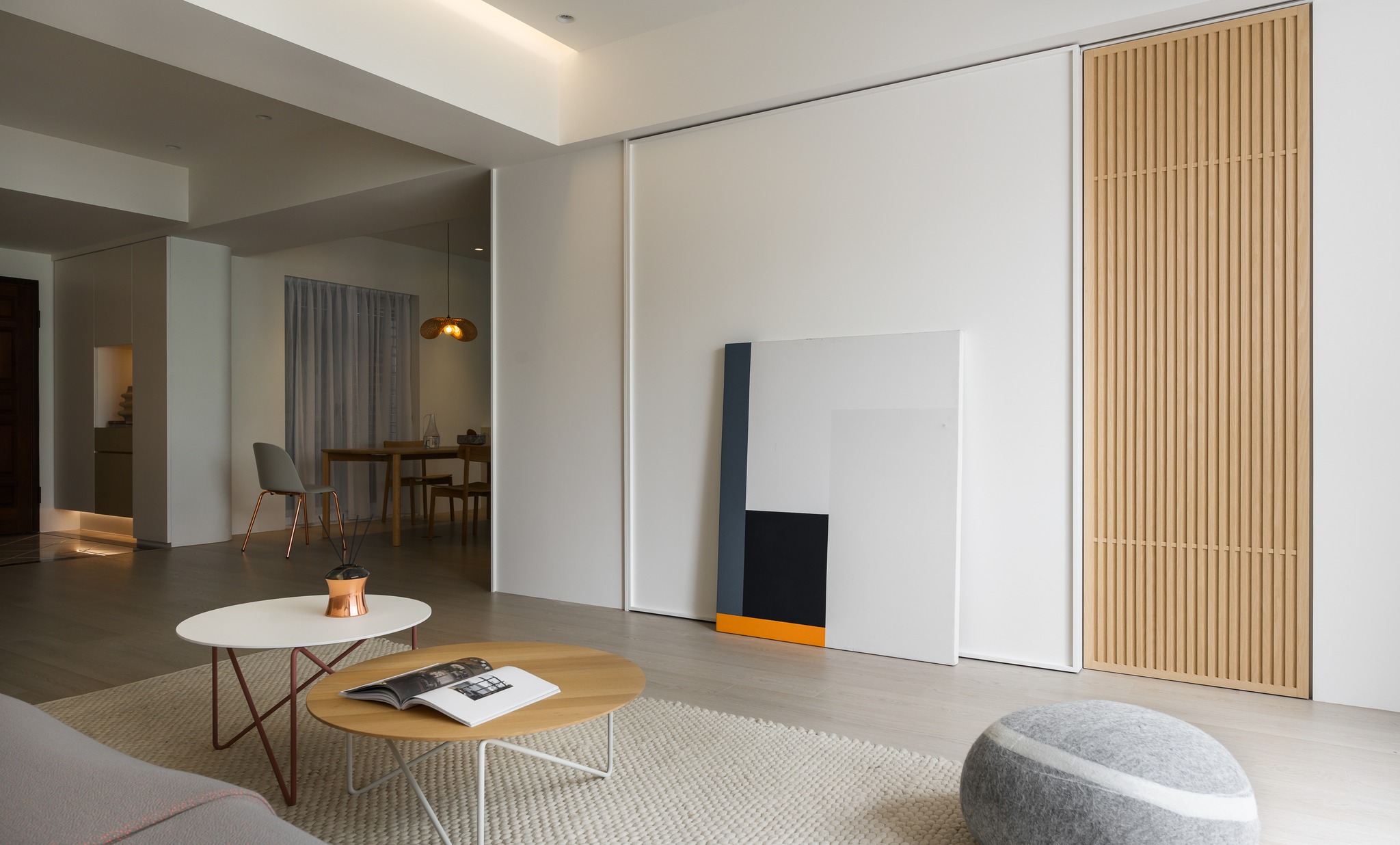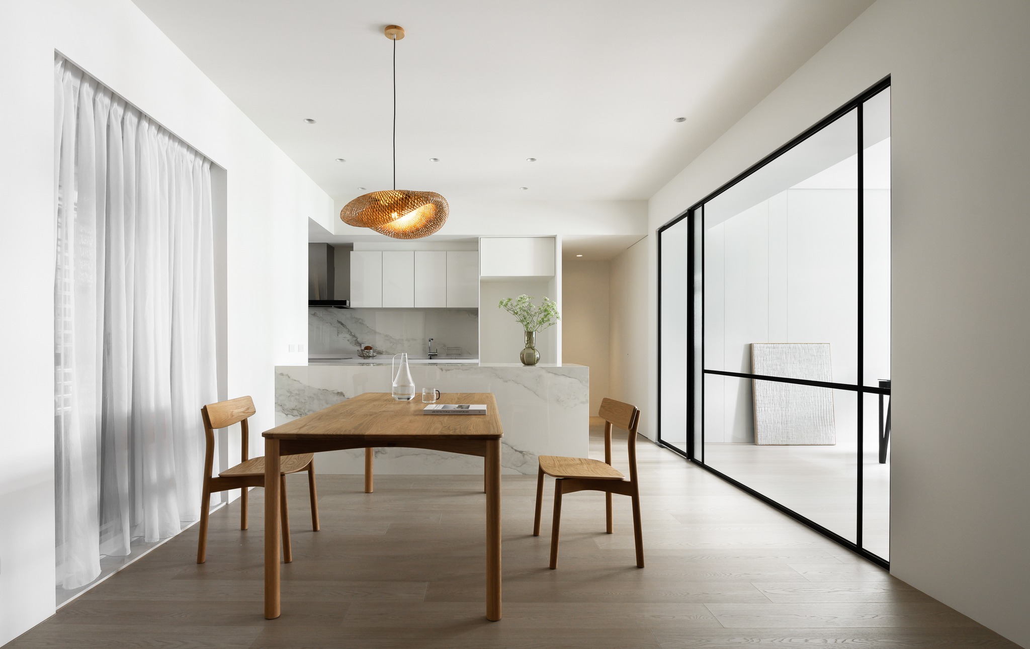 改造後的客廳和廚房改為打通的處理方式,一方面解決上面說的曬衣間的問題和家人交流隔離的狀況(油煙部分則用更新的科技去處理就可以解決了)在整體設置上也偏向木質調、暖色又不失典雅的鋪陳,整體看上來陽光的介入也變成了參與者,透明玻璃的設計作為分隔,一方面視覺能夠顯得更為寬大廣闊不受限之外,和整體裝潢造景相容且相融,整個家的溫度感也提高了非常非常多