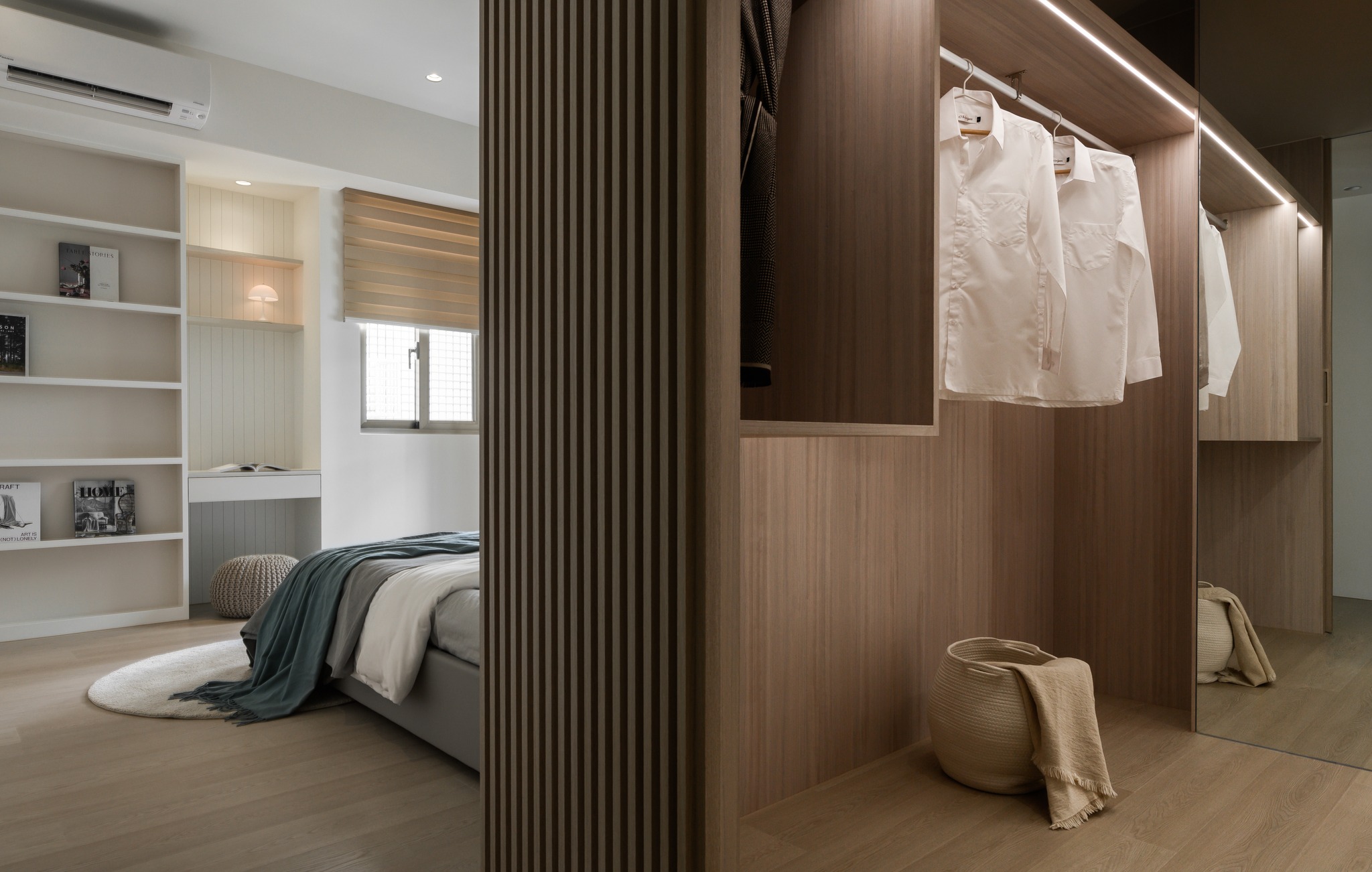 臥室和衛浴的部分,把整體空間加以利用,完美落實對自己好一點,除了有更衣室的設置之外,也有一小個辦公區域能夠不離開自己房間簡易處理事務的空間,另外整體因為色調選擇,也顯得更窗明几淨,主臥的設計看起來較為簡單暢快相對比原本規劃不完善的壅擠和沉著老態感覺有很大的出入,基本上整體變動屋主非常之滿意,畢竟疫情之後也少接待人到家裡去了,自己也就更覺得應該好好規劃自家空間,重新裝潢翻修一番,該有的都得有,該改善的也都得到了完善。