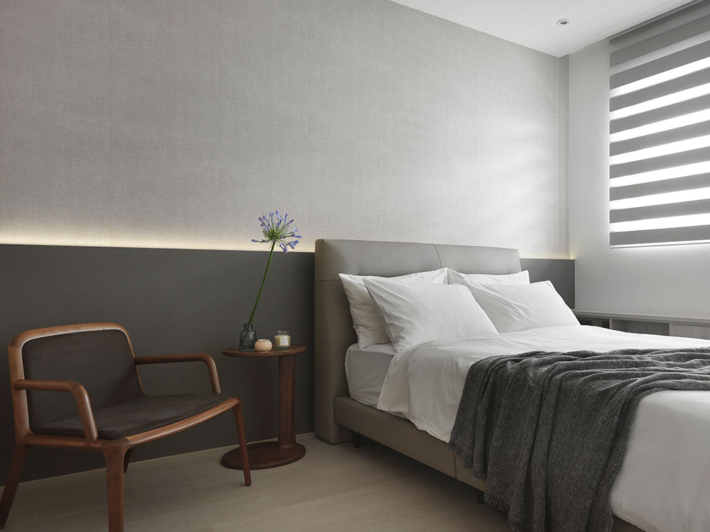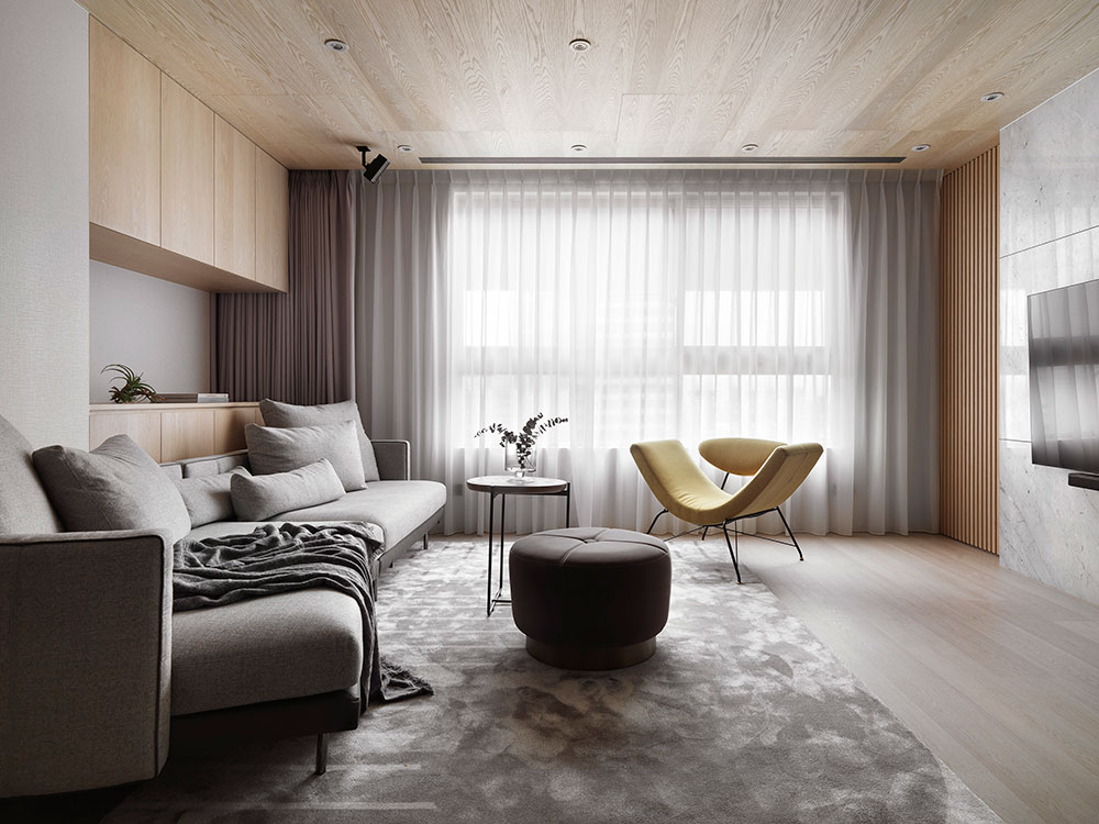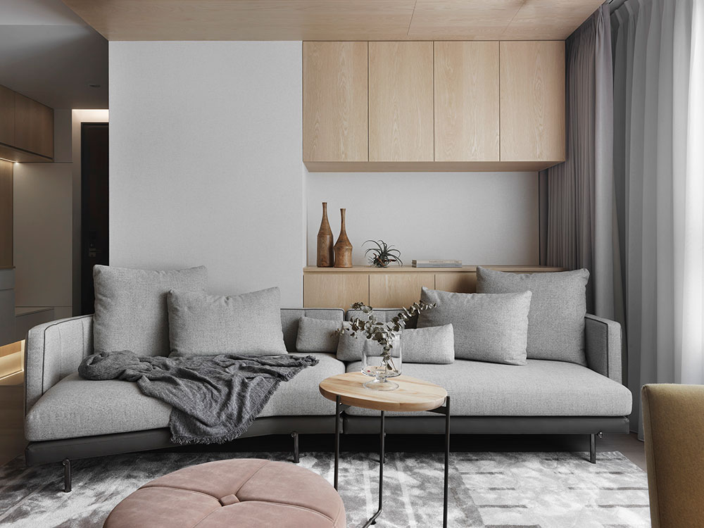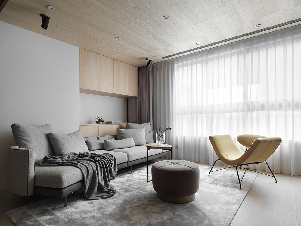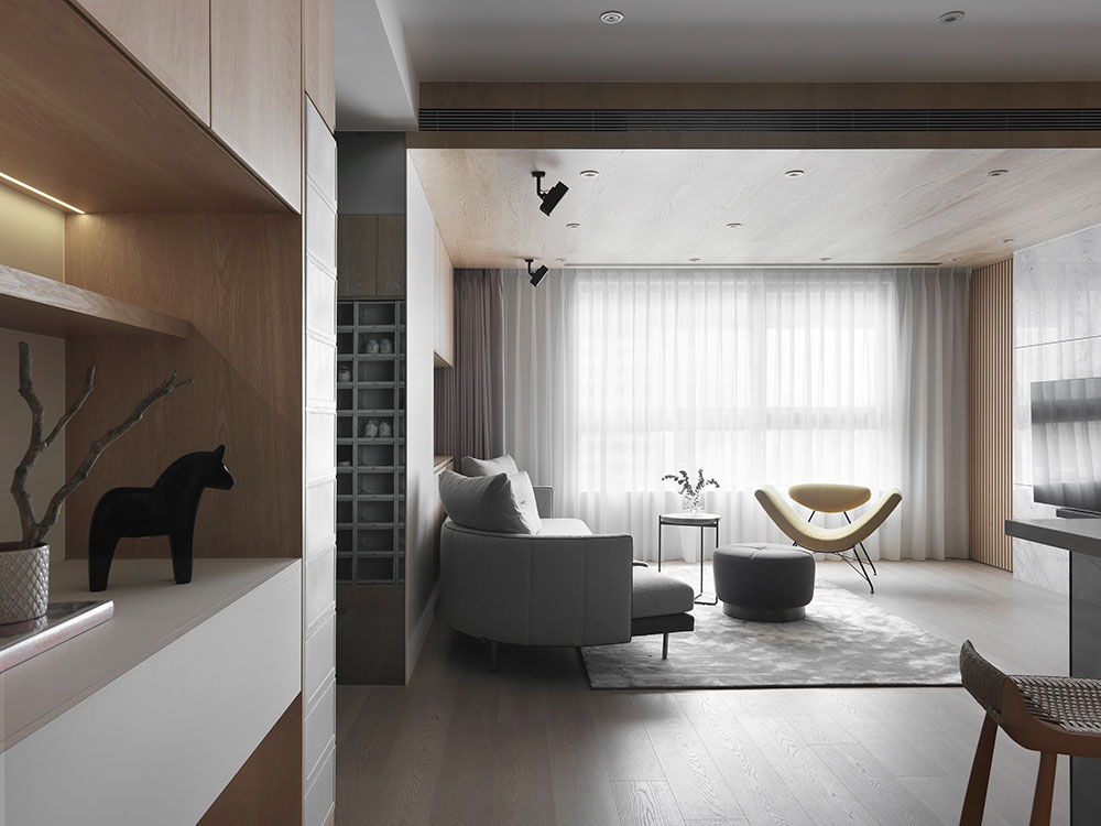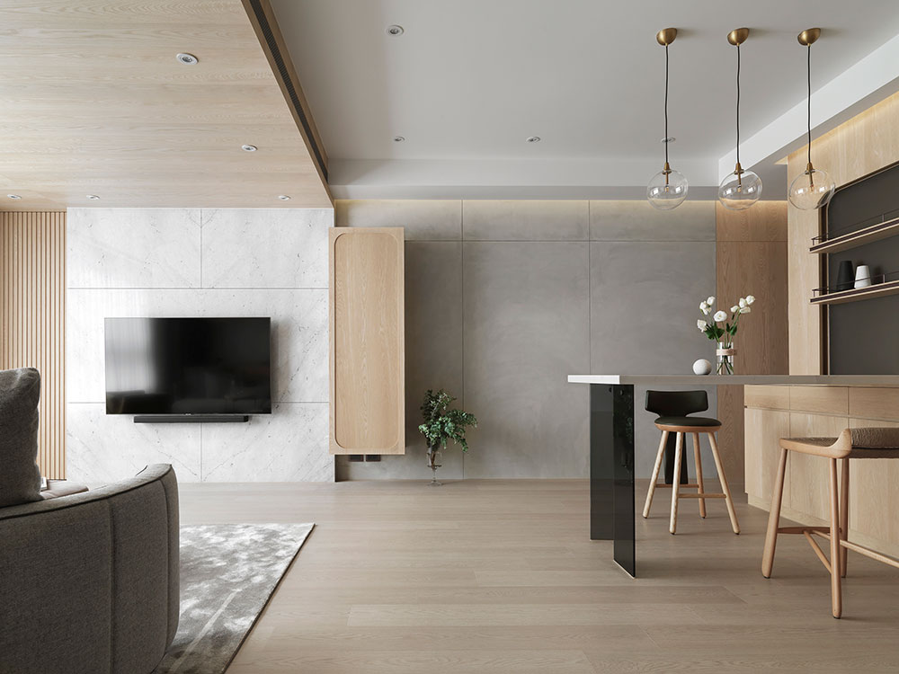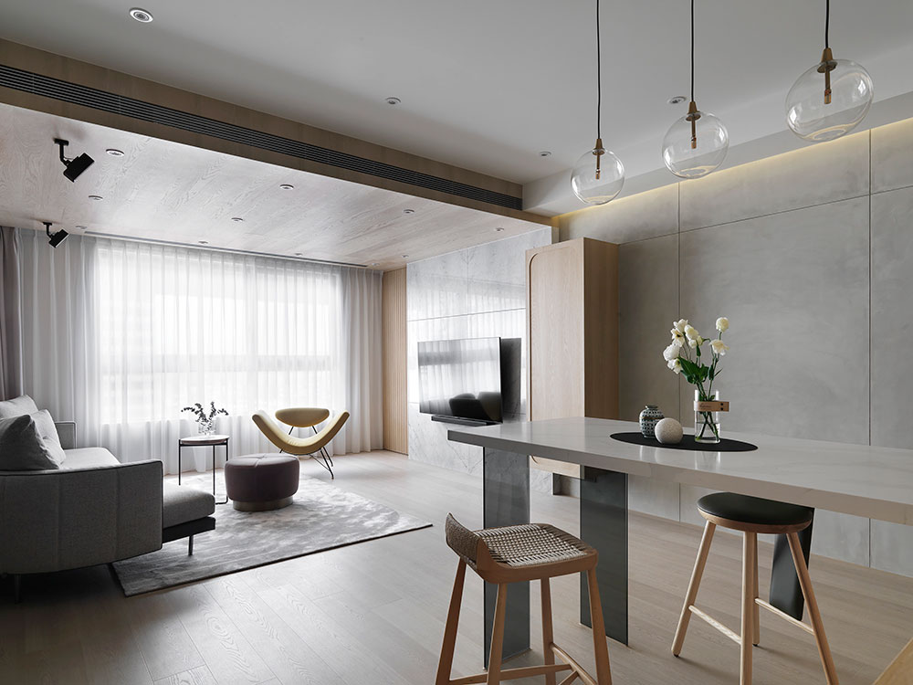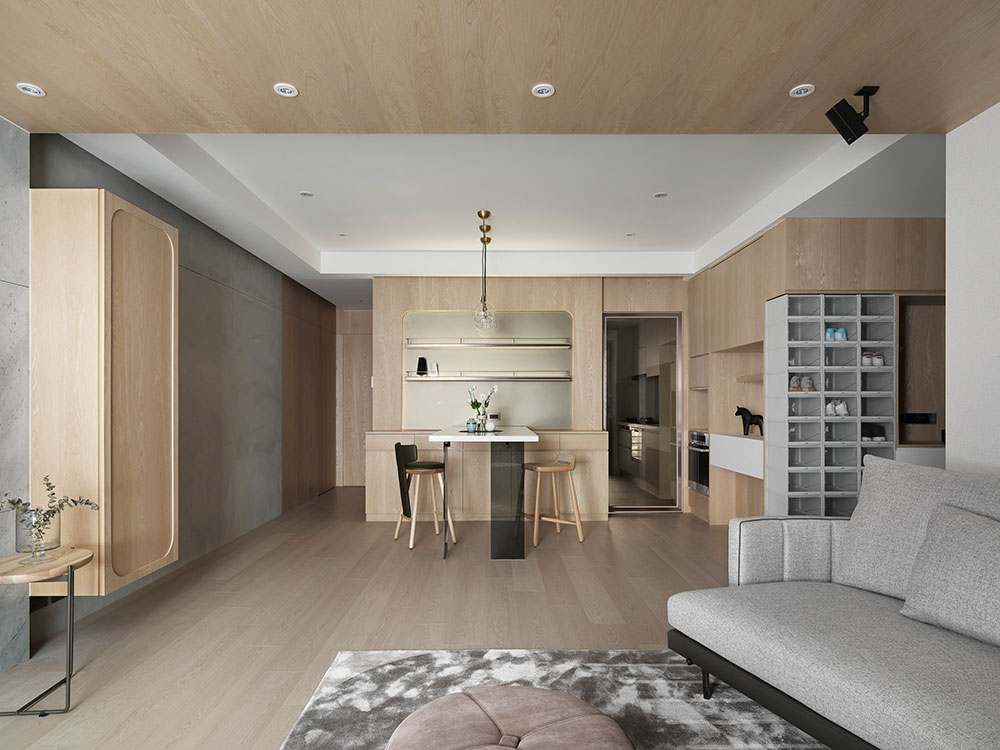由於單身屋主先前長期定居日本,因此 30 坪的日式簡約風住宅,透過清晰的動線規劃、柔和的色彩配置,塑造出屋主與兩隻狗狗的日系空間,讓家既熟悉又充滿新意。 設計師在玄關區,利用 3 公分高的地板落差,打造日式的玄關落塵區,同時結合穿透性高的機能鞋櫃,展示屋主的鞋子收藏。考量到公領域大梁過於低矮,因此客廳以溫潤的木皮天花板,跳脫出輕盈感受,再搭配屋主的既有家具,色調顯得相當契合。 餐廳藉由質樸的清水模牆,搭配溫暖的木皮電視櫃,營造放鬆的入門第一印象。而玻璃桌腳的輕盈吧台,取代制式餐桌,加上燈帶點綴的展示酒櫃,讓此處成為休閒小酌的最佳場所。書房的收納櫃,則採取不規則切割設計,給予屋主多元的使用彈性。