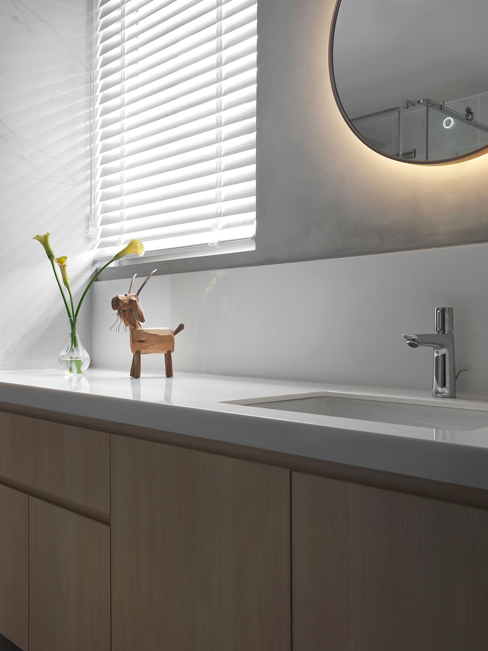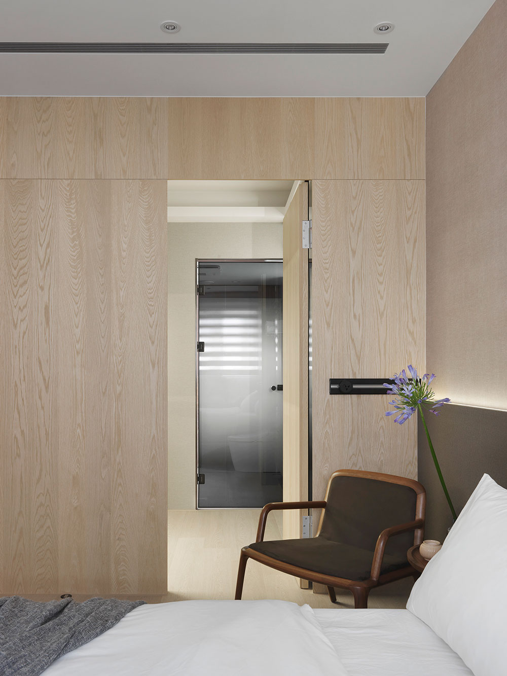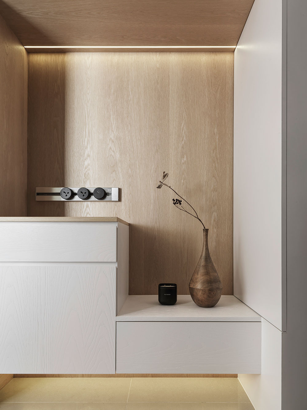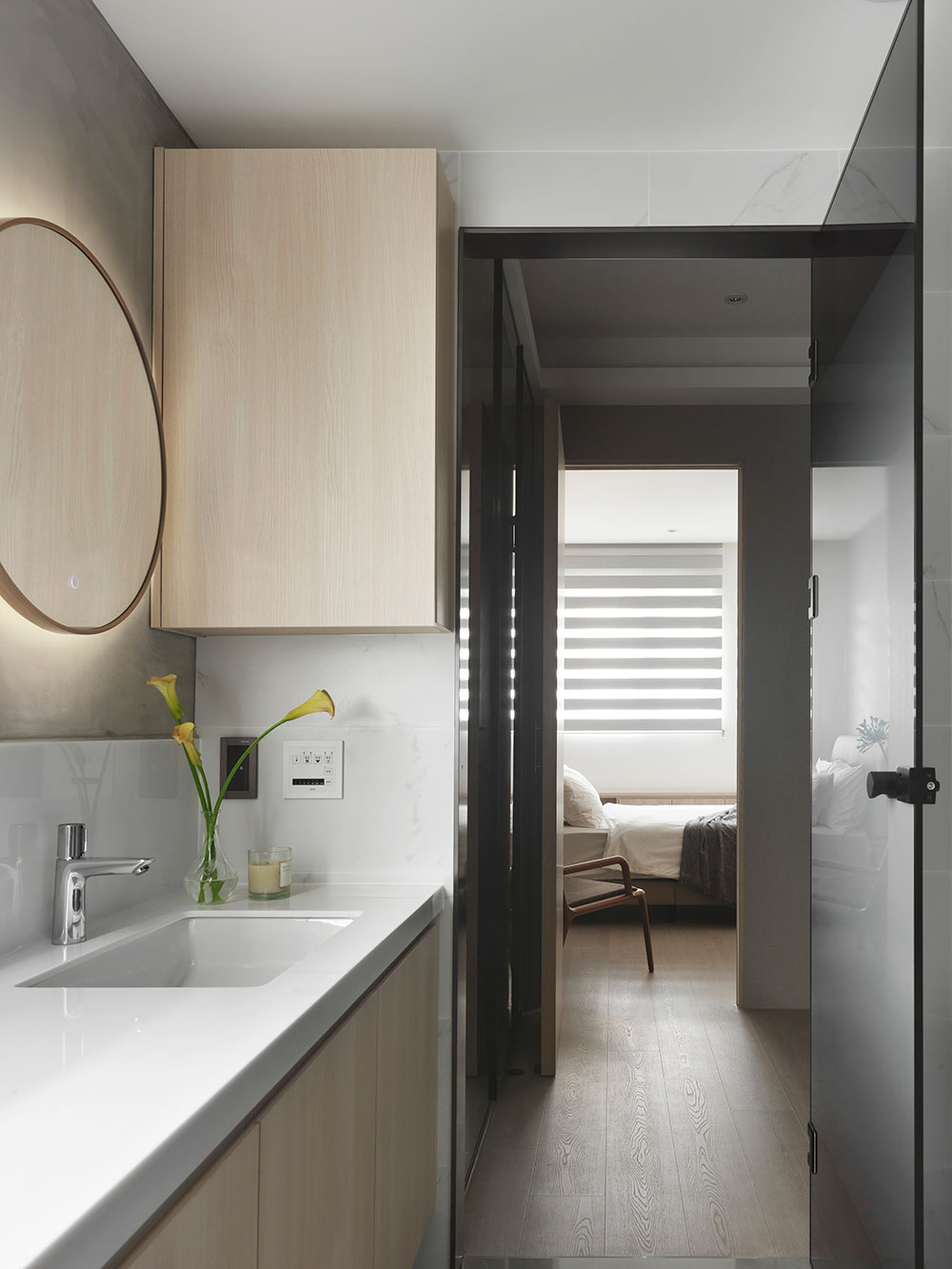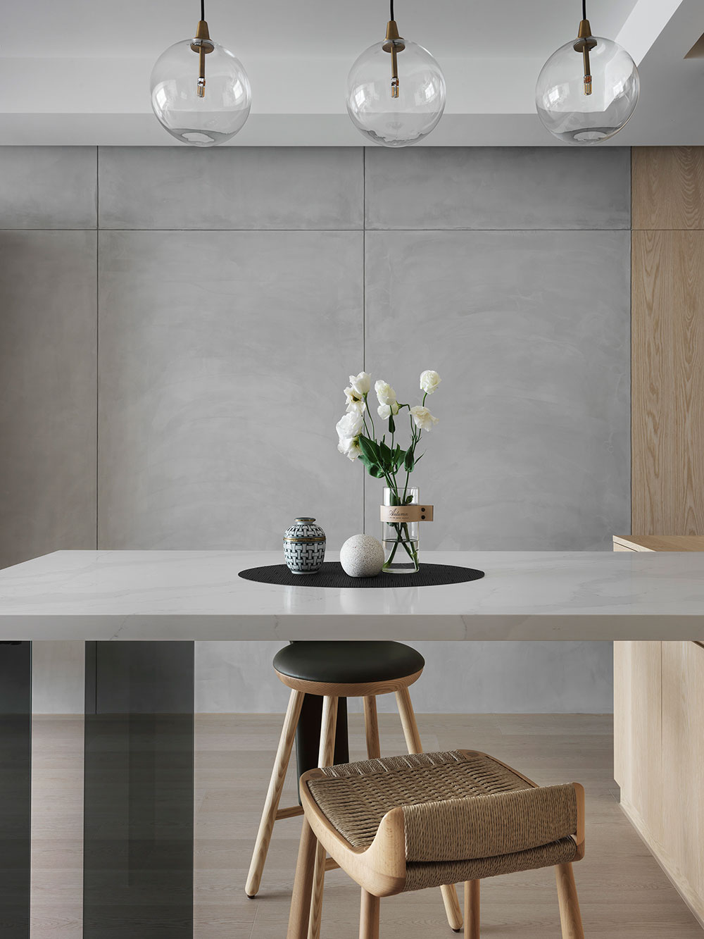 由於單身屋主先前長期定居日本,因此 30 坪的日式簡約風住宅,透過清晰的動線規劃、柔和的色彩配置,塑造出屋主與兩隻狗狗的日系空間,讓家既熟悉又充滿新意。 設計師在玄關區,利用 3 公分高的地板落差,打造日式的玄關落塵區,同時結合穿透性高的機能鞋櫃,展示屋主的鞋子收藏。考量到公領域大梁過於低矮,因此客廳以溫潤的木皮天花板,跳脫出輕盈感受,再搭配屋主的既有家具,色調顯得相當契合。 餐廳藉由質樸的清水模牆,搭配溫暖的木皮電視櫃,營造放鬆的入門第一印象。而玻璃桌腳的輕盈吧台,取代制式餐桌,加上燈帶點綴的展示酒櫃,讓此處成為休閒小酌的最佳場所。書房的收納櫃,則採取不規則切割設計,給予屋主多元的使用彈性。
