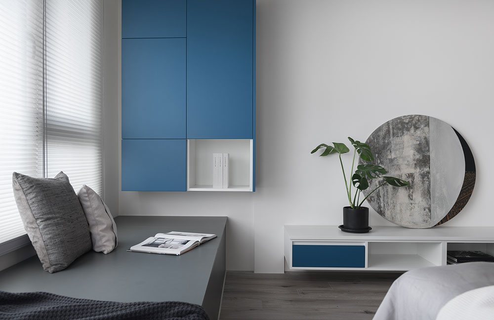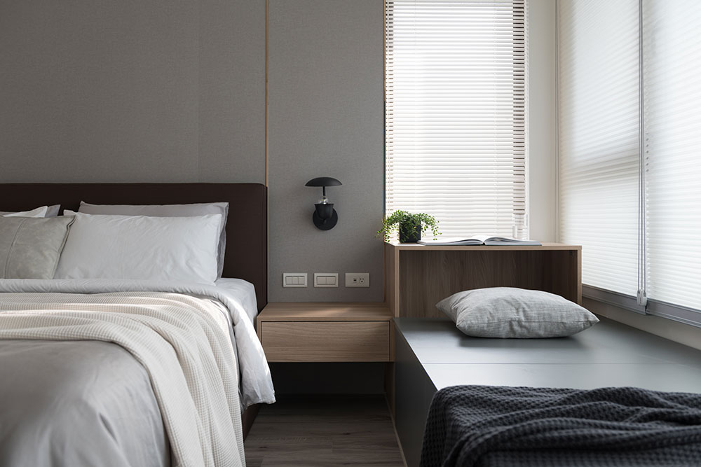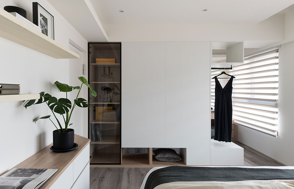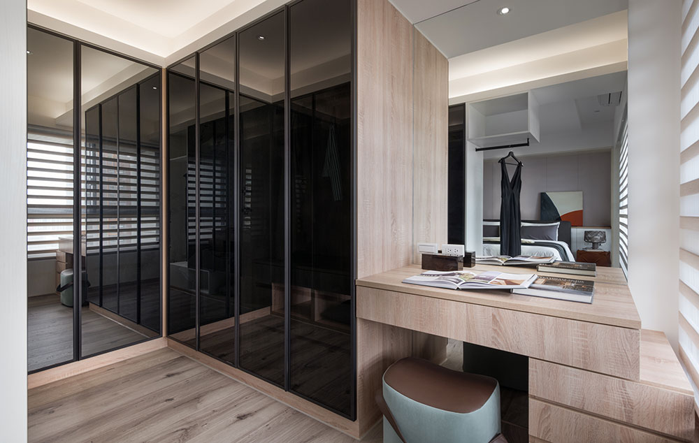 53坪單層宅邸,因應三代同堂的居住成員,援引中性簡約的現代風格,除去多餘而煩瑣的裝飾,注入黑、白、灰三色,串連木質調呈現自然樸實的氛圍,打造全家人都滿意的居家空間。 玄關區域,兩側以櫃體結合牆面打造偌大的收納機能,左側運用鏡面為門片,製造放大的空間感,更為進出之間,留下審視穿搭的角落。公共區域,以落地窗引入光線與通透氣息,並採開放式手法串連客廳與餐廚區域,形塑寬敞舒適的居家樣貌,兩處的場域界線,悄悄以天花的木質取代實牆,維持視線的順暢流通。客廳區域,沙發背牆則以白色木格柵寫下細膩的層次感,並適時以原木妝點製造畫龍點睛的效果,與清水模塗料的電視主牆共創暖心質樸的感受。餐廚區域,以二字型動線增設中島吧台,讓備餐或收拾都更為彈性便利,令人享受於美好的料理時光。