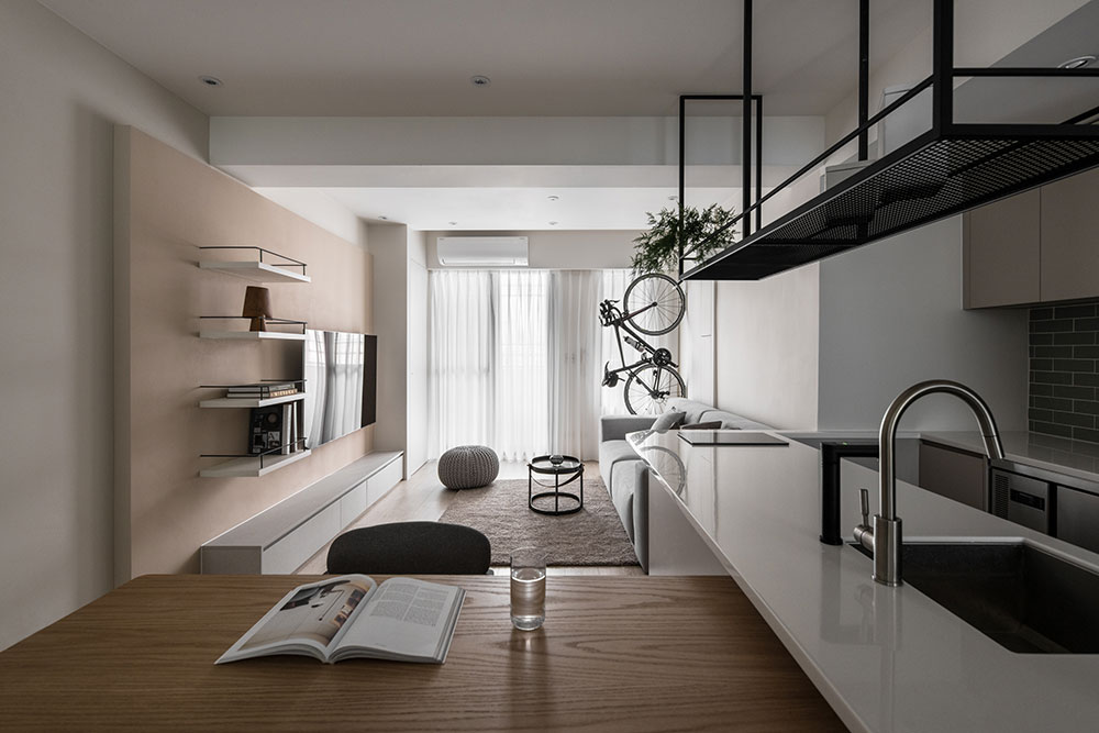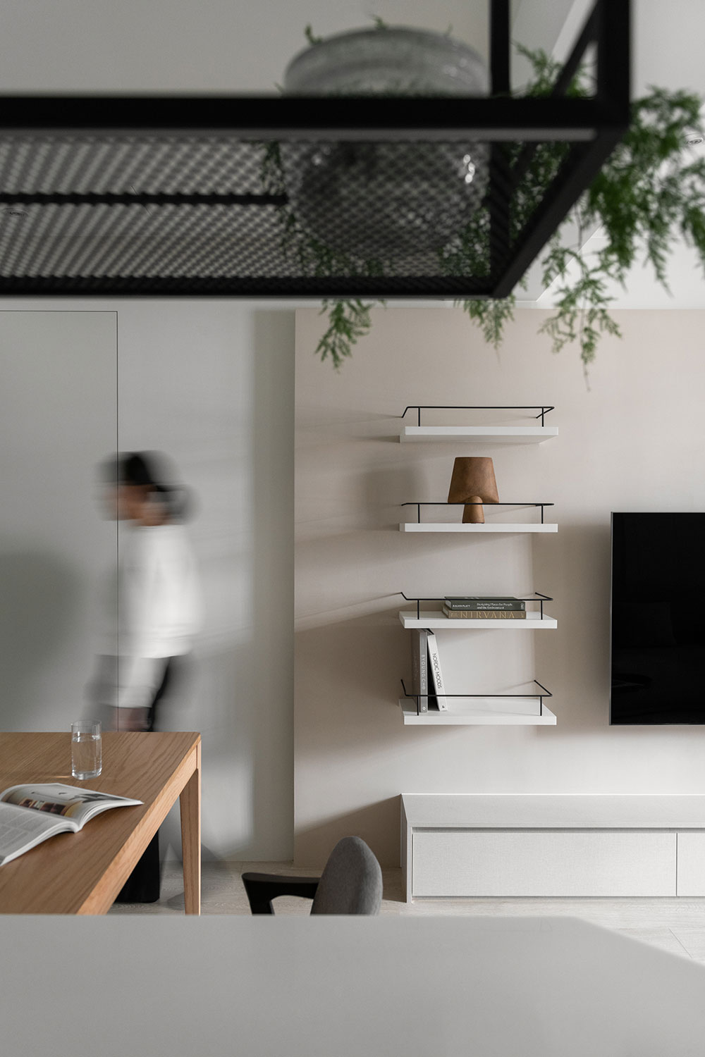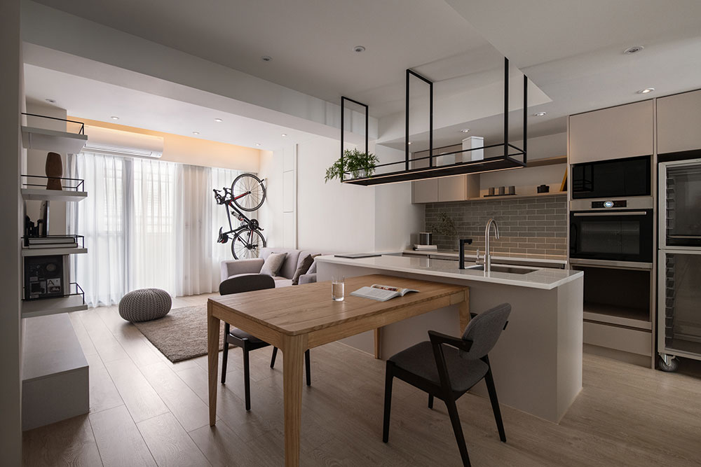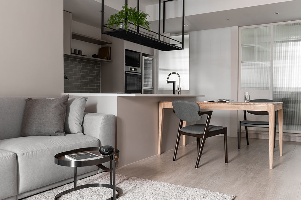 全室以純淨的白色作為基底,設計上以溫潤的木質元素營造無印風格,住宅裡瀰漫著自然簡單的氛圍,客廳挑選輕柔的透光紗簾迎來清透日光。開放式 L 型廚房特別規劃延伸的中島檯面,優化廚房料理動線,除了增加廚下的收納空間外,更拉近了廚房與客廳間的距離,以淺色風的方式讓整體的空間氛圍感受起來溫暖許多,特別將玄關鋪設的六角花磚延伸到開放式廚房,創造木系無印宅裡的個人特色外,也更利於廚房清潔維護。