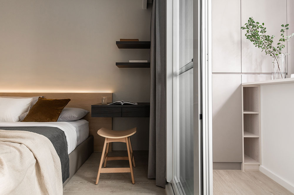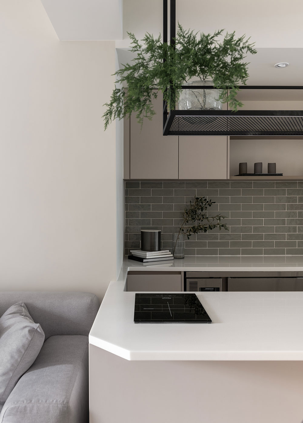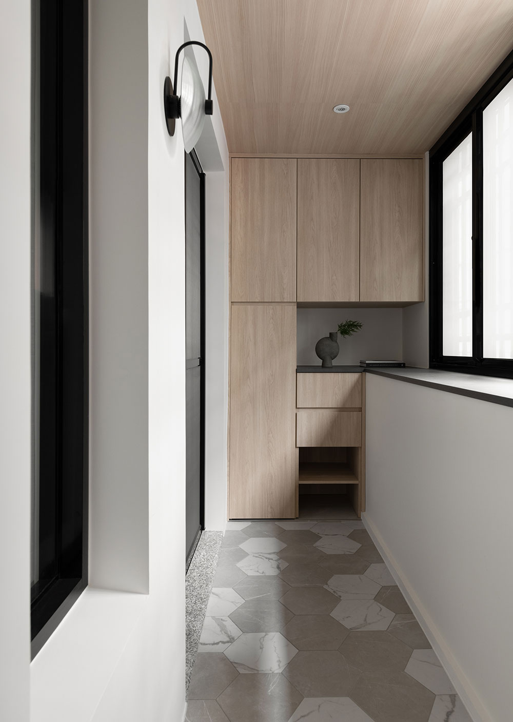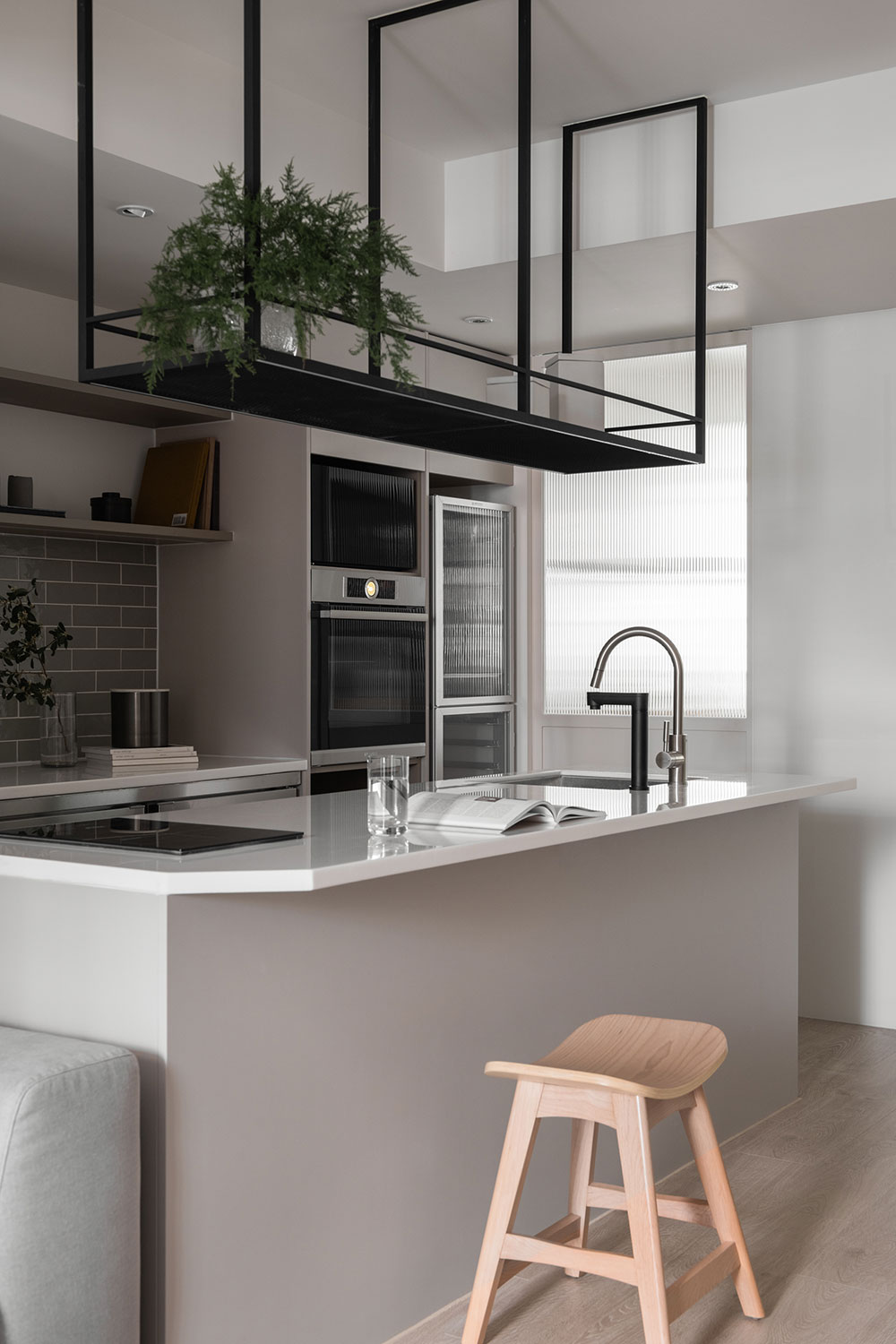 全室以純淨的白色作為基底,設計上以溫潤的木質元素營造無印風格,住宅裡瀰漫著自然簡單的氛圍,客廳挑選輕柔的透光紗簾迎來清透日光。開放式 L 型廚房特別規劃延伸的中島檯面,優化廚房料理動線,除了增加廚下的收納空間外,更拉近了廚房與客廳間的距離,以淺色風的方式讓整體的空間氛圍感受起來溫暖許多,特別將玄關鋪設的六角花磚延伸到開放式廚房,創造木系無印宅裡的個人特色外,也更利於廚房清潔維護。