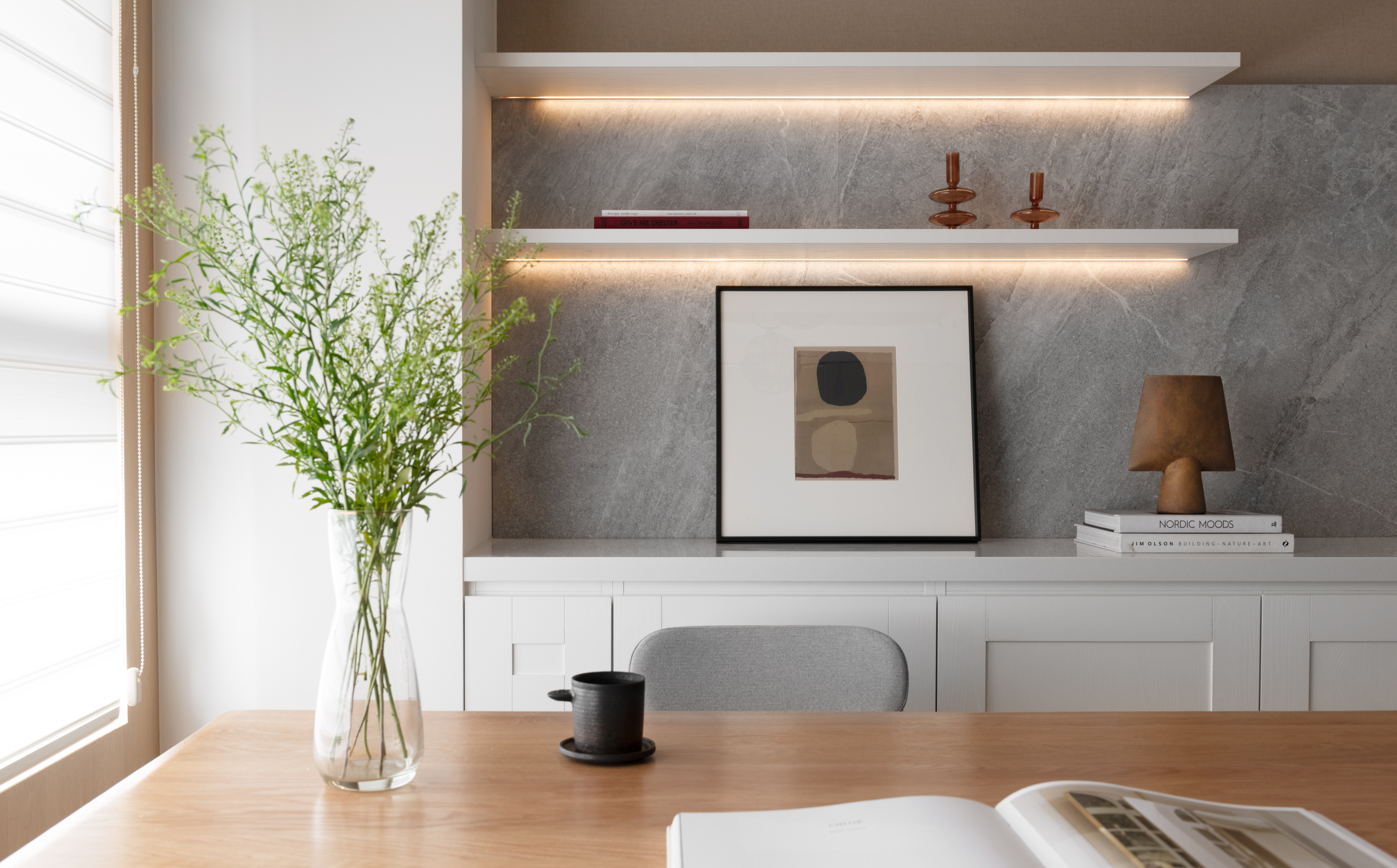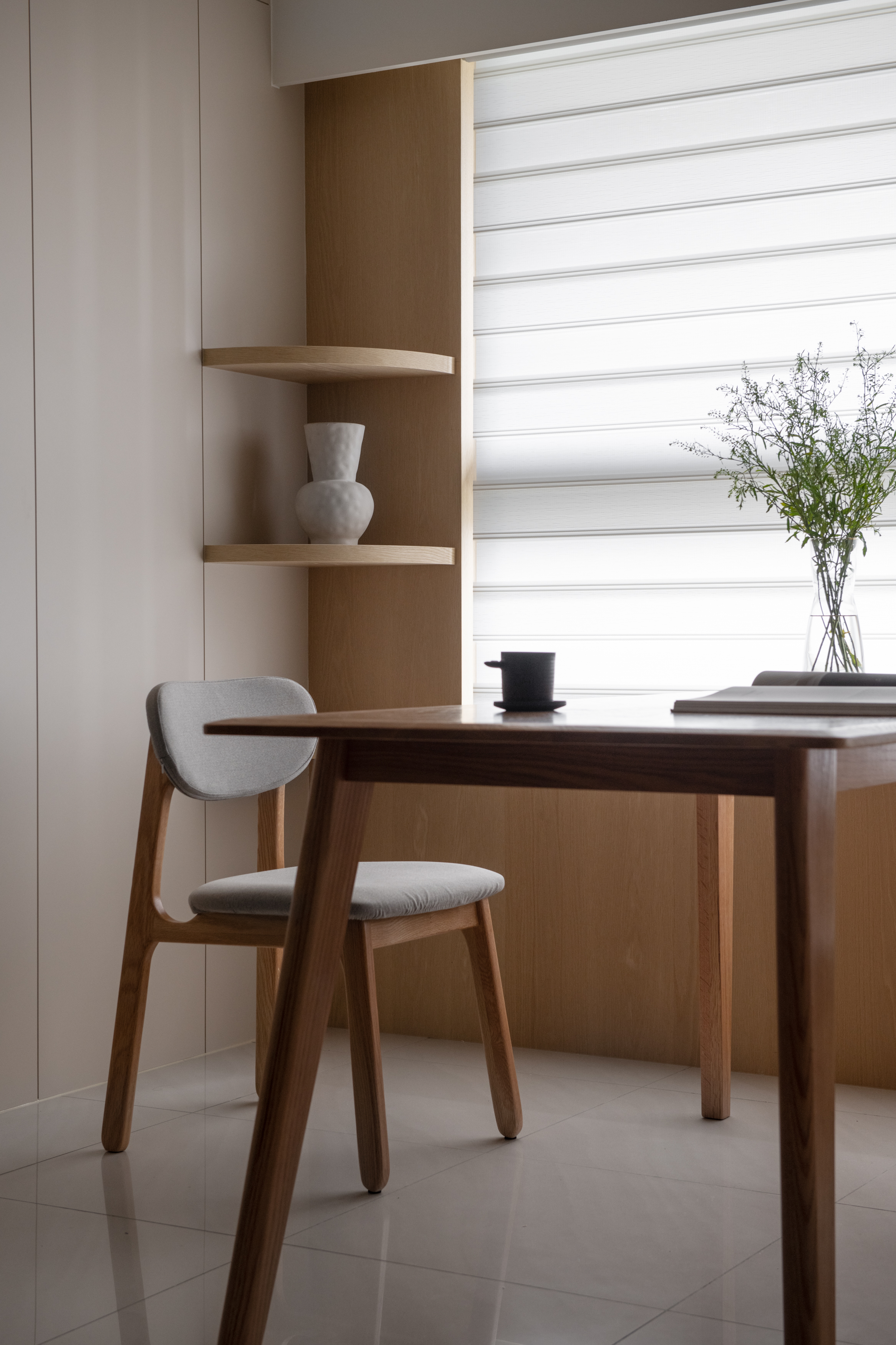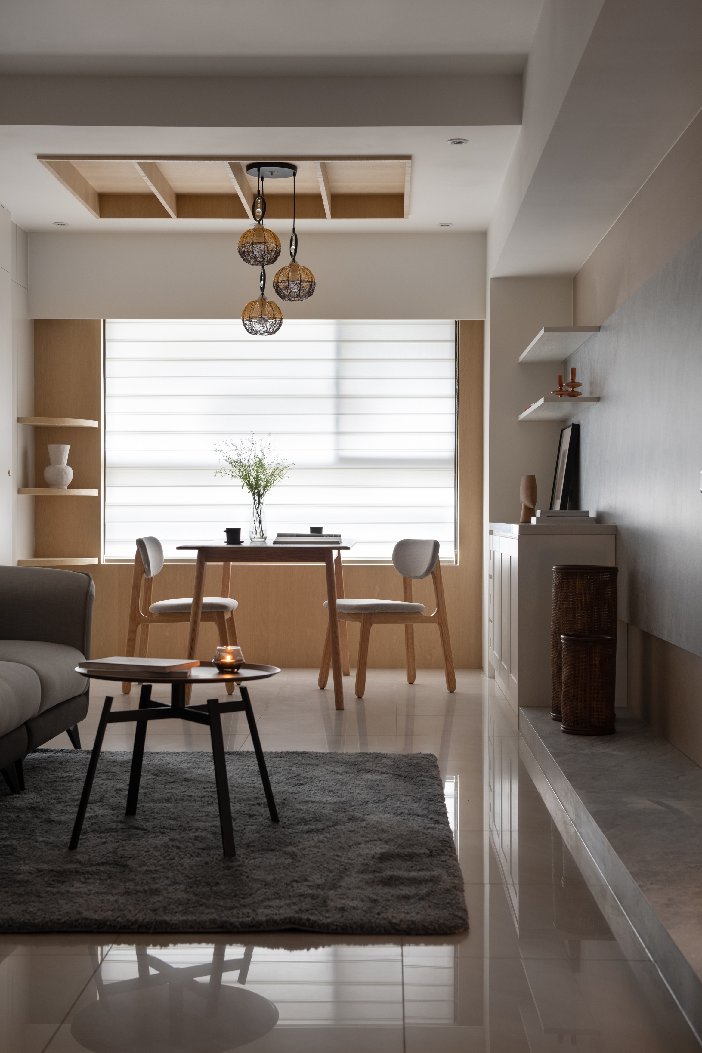 我們在客廳的部分,針對退休宅特別設計一塊多功能區域,可以讓家人們在這裡看書、泡茶、聊天…等,在窗邊強化室內氣氛與戶外景觀連結性,打造倍大自然環抱的空間氛圍。也讓整天空間呈現一字型,在走動的過程中不會因為空間規劃的不協調產生安全疑慮的問題。拓寬公領域幅度,滿足退休生活想要的寬鬆感。