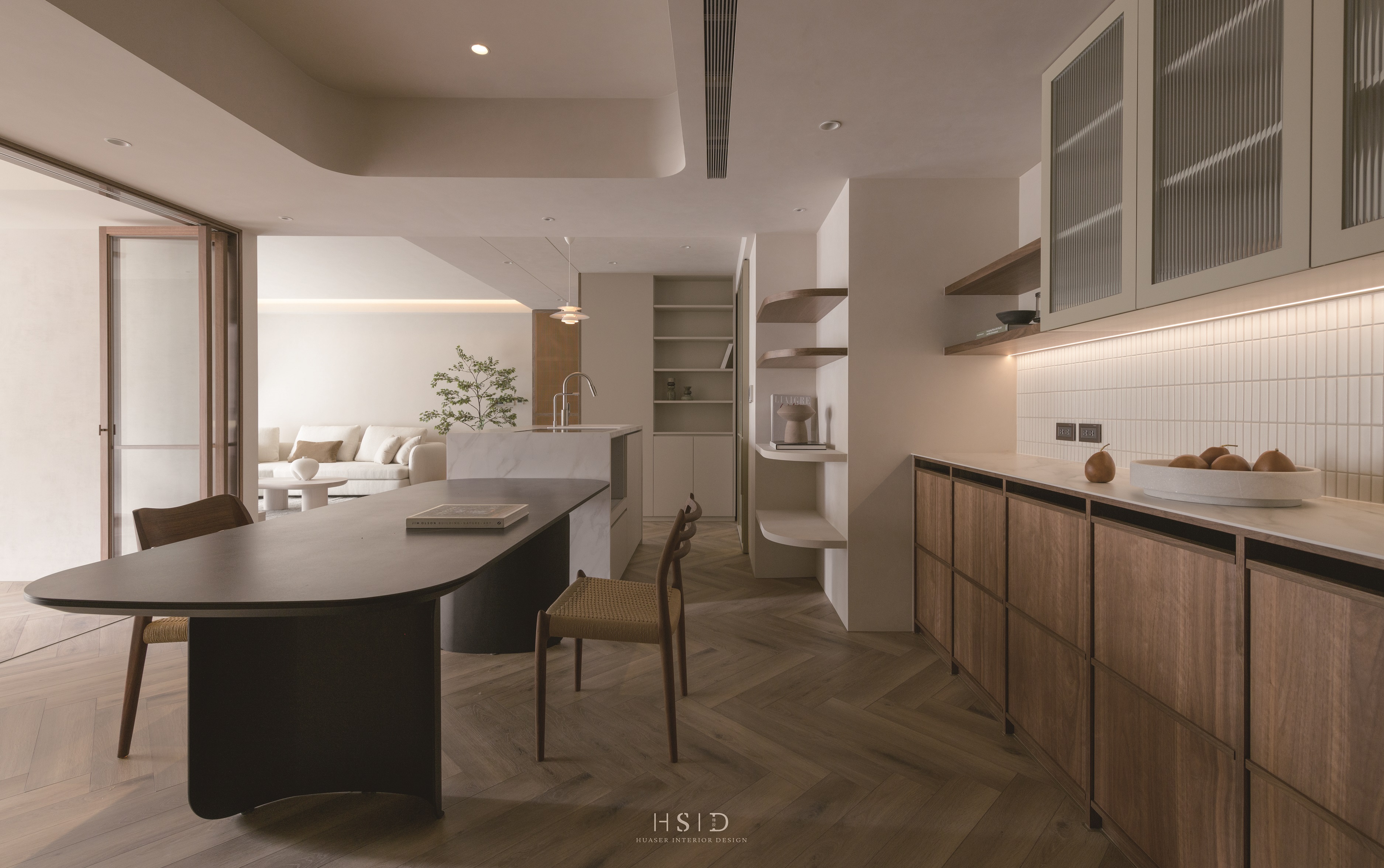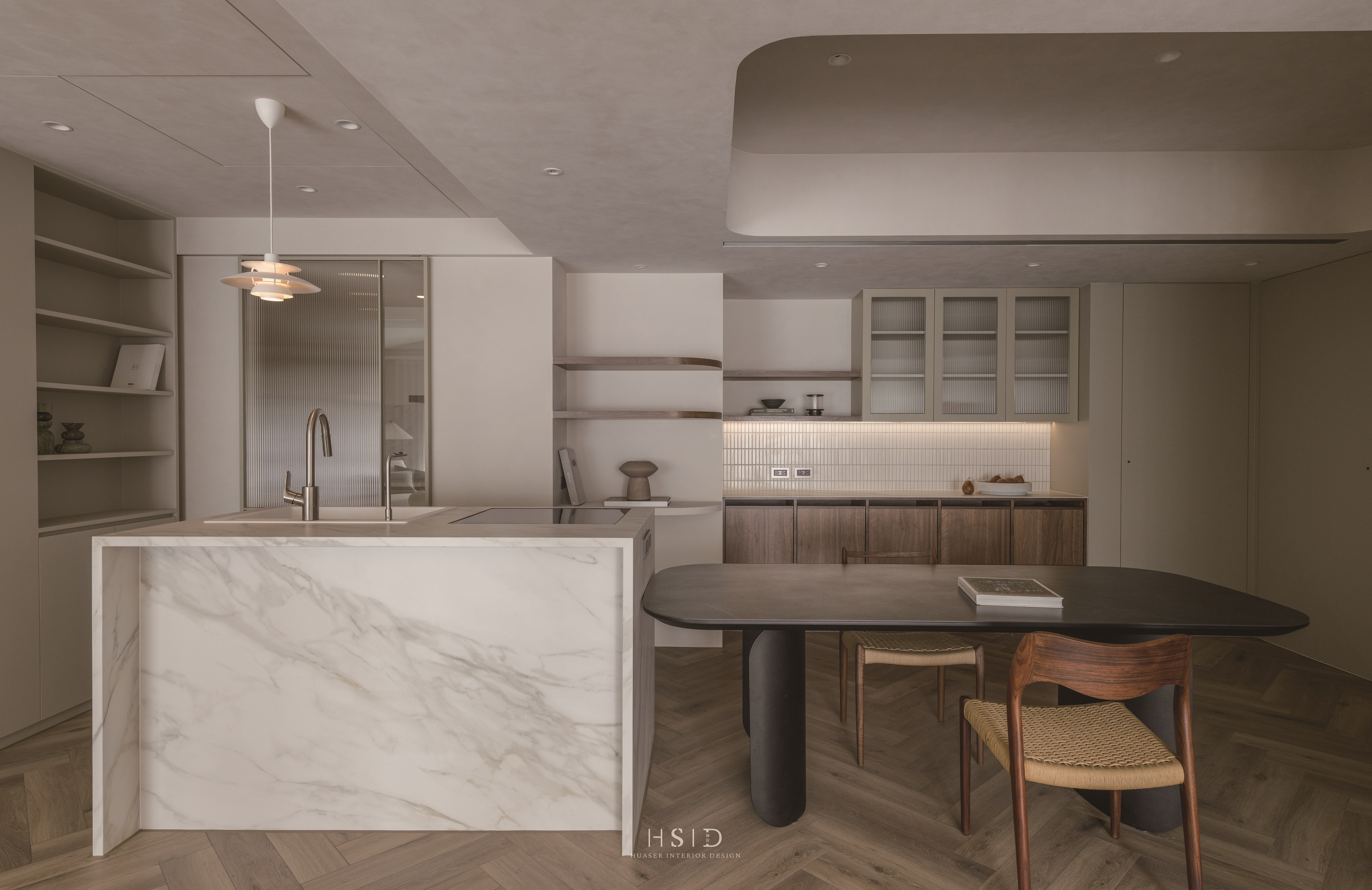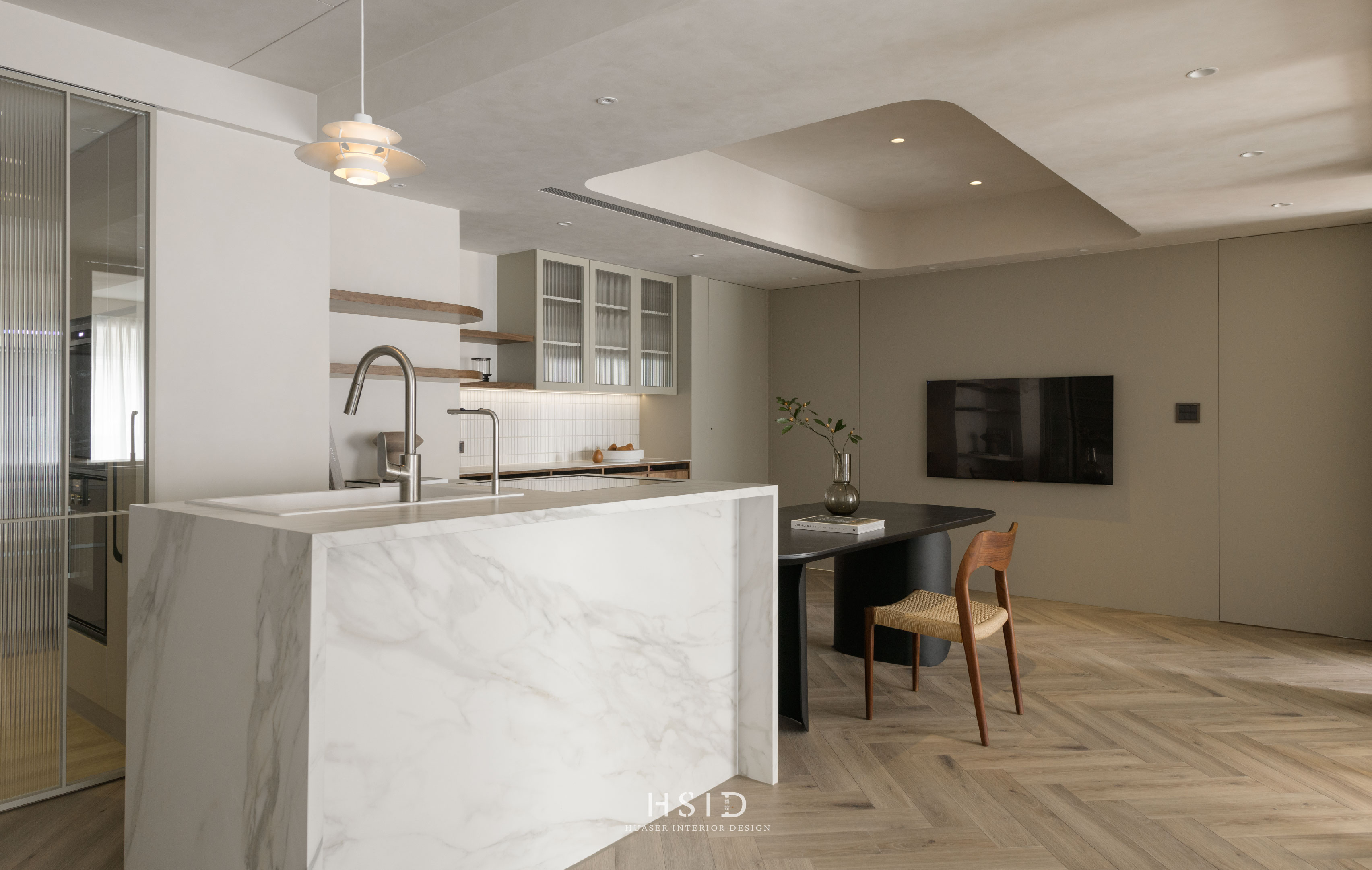 特別值得一提的是客廳及餐廳天花板的圓弧面造型,增添了屋主對家的凝聚感和視覺感,呈現出「家即是窩」的意識。而餐廳區的中島設計則考慮到了平時烹飪輕食、加熱小點之外,內廚的部分也無須擔心,貼心設置的拉門可以阻隔油煙味道。