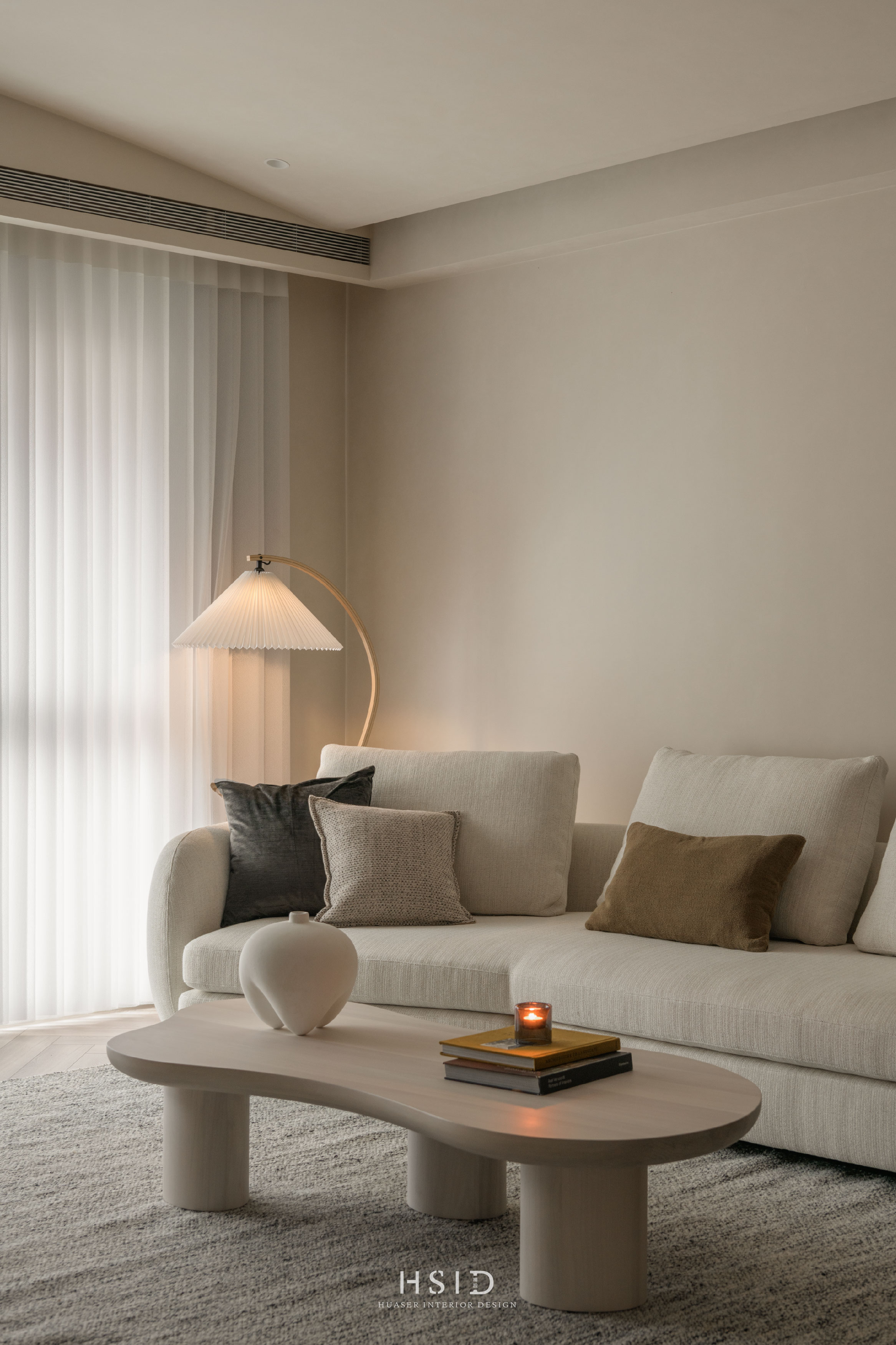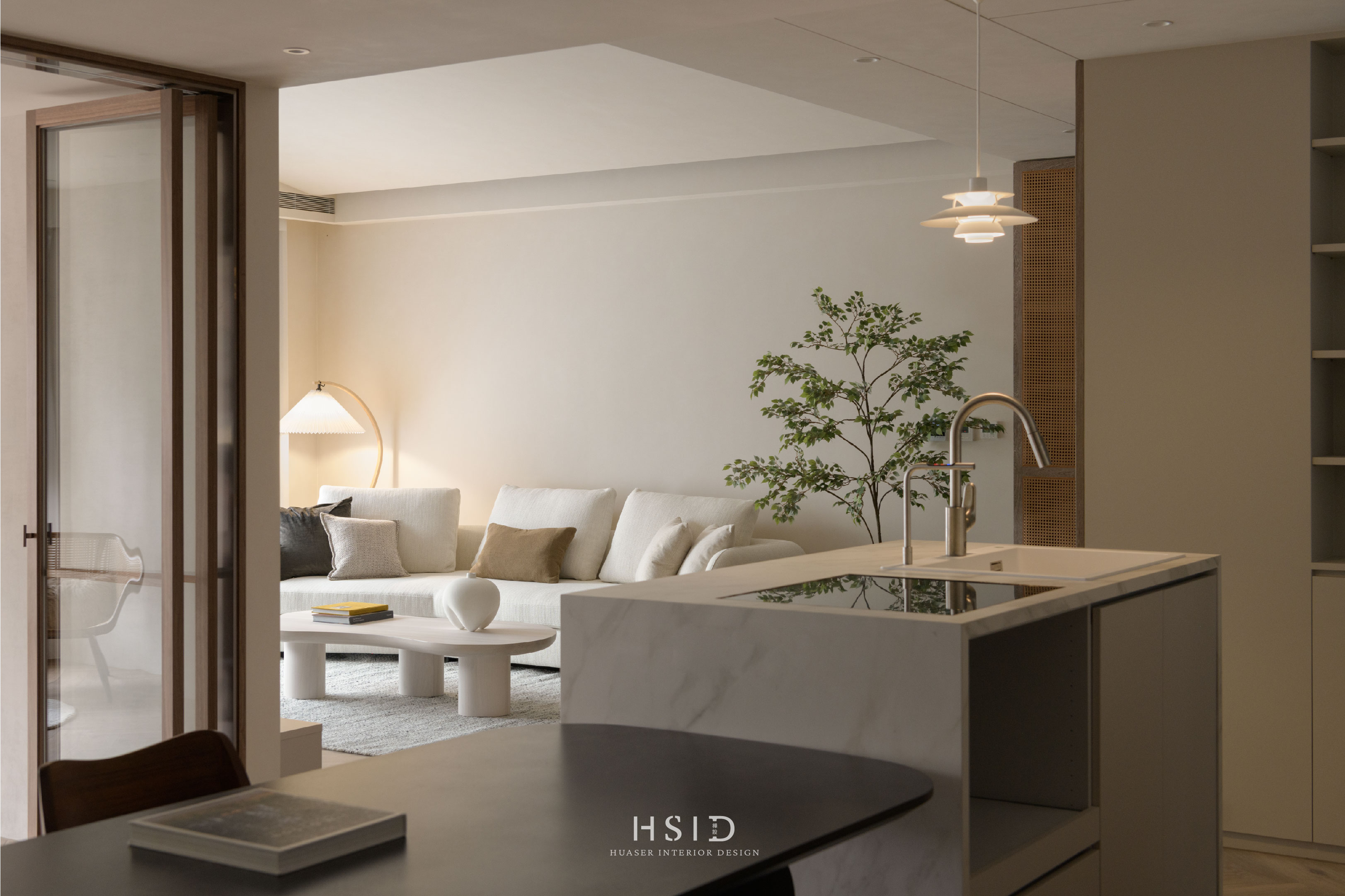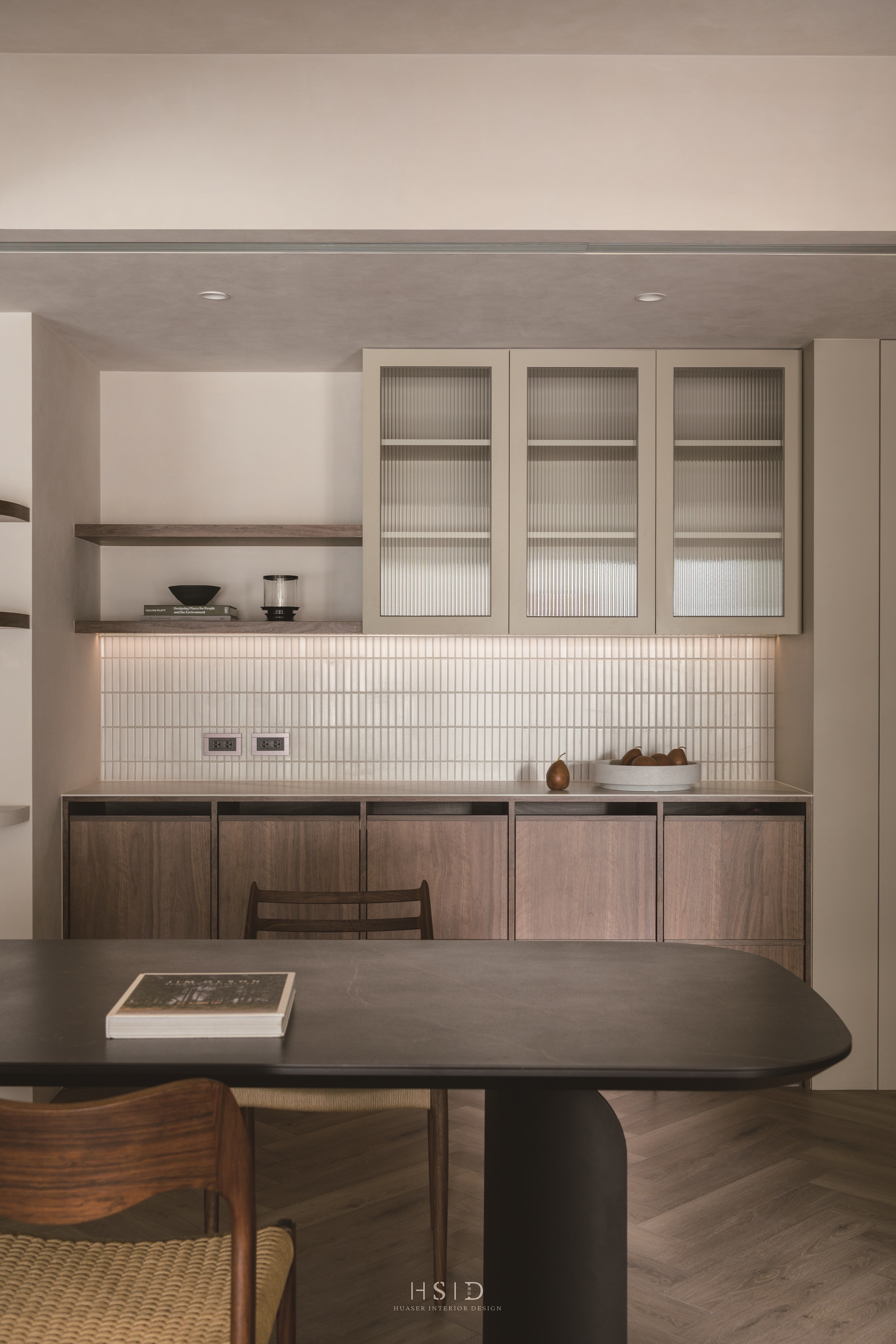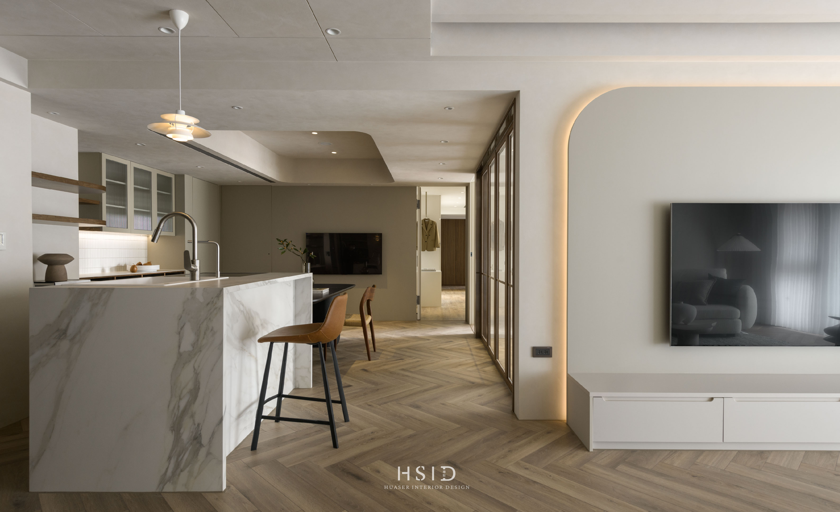 特別值得一提的是客廳及餐廳天花板的圓弧面造型,增添了屋主對家的凝聚感和視覺感,呈現出「家即是窩」的意識。而餐廳區的中島設計則考慮到了平時烹飪輕食、加熱小點之外,內廚的部分也無須擔心,貼心設置的拉門可以阻隔油煙味道。
