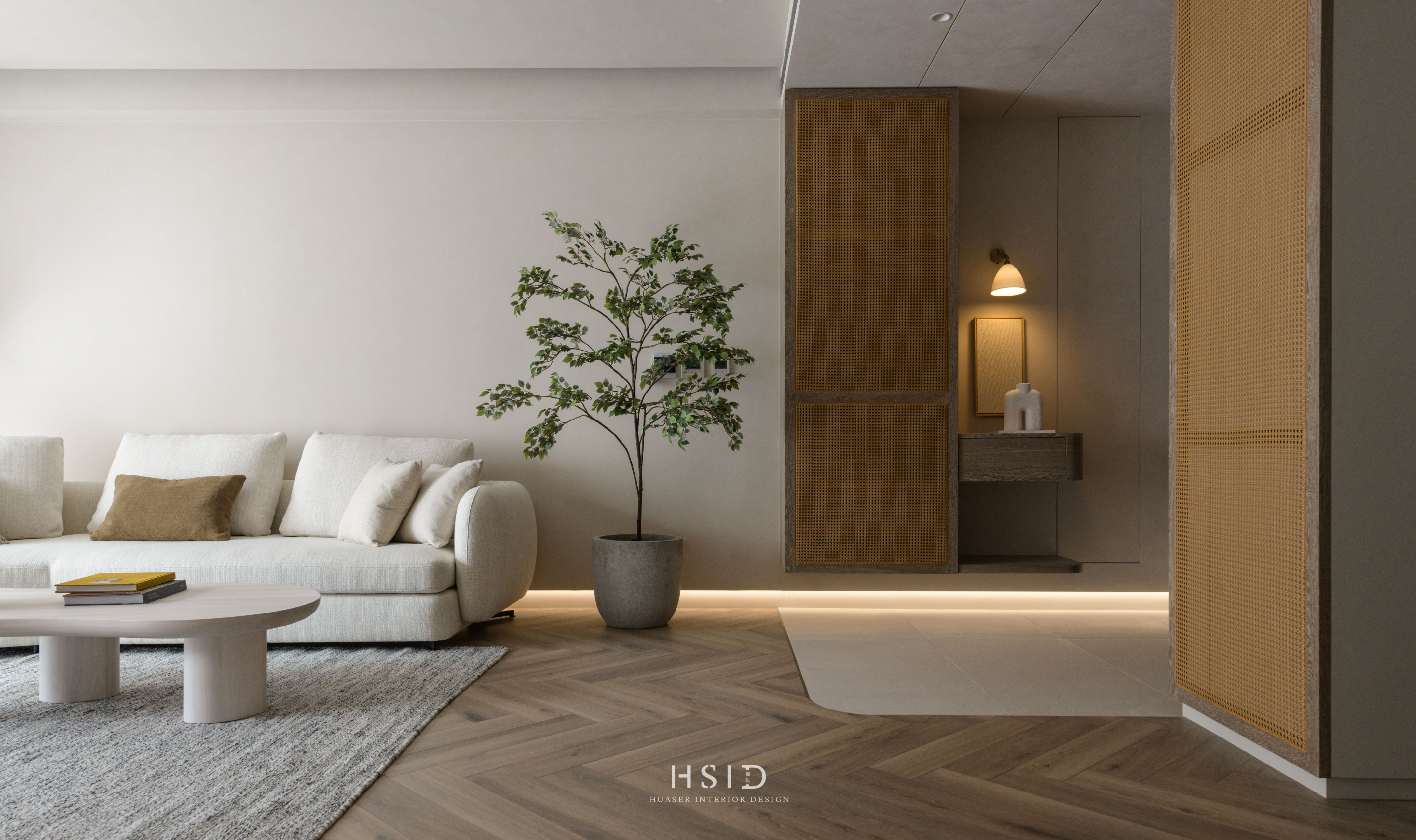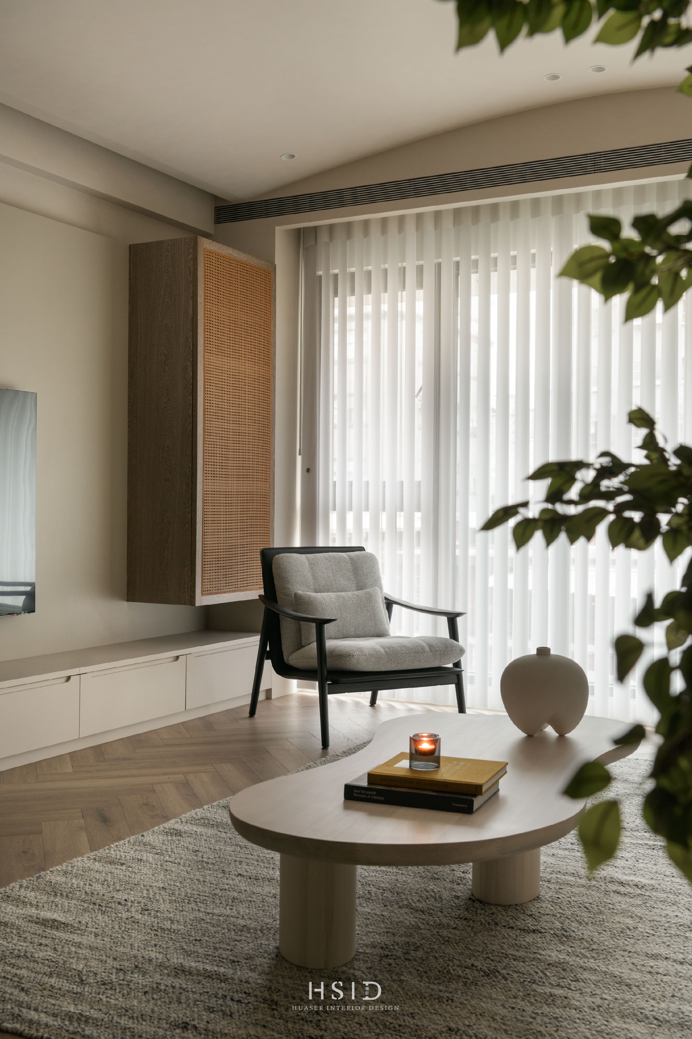 整體規劃選用相近的色系,米色調的礦物塗料將牆壁和天花板延伸為一體,手刷的自然紋路並搭配藤編材質、人字拼木地板等等,呈現出平靜、自然和溫馨的居家感。