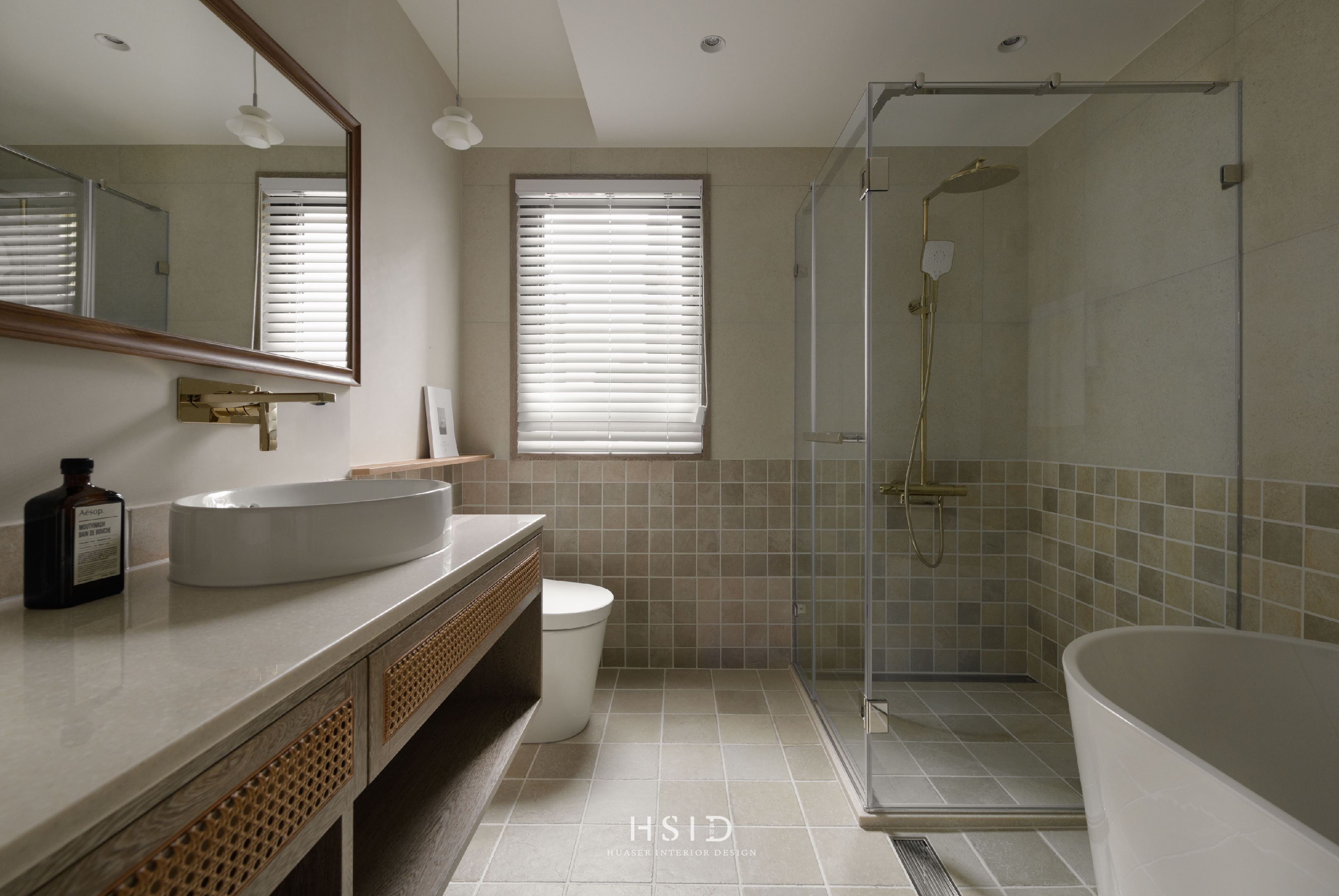 衛浴空間除了雙盆造型可以節省居住者在使用上的時間之外,另外選用畫框的鏡面框架,搭配大地色系磁磚和竹編造型抽屜點綴,配上金屬色系配件,呼應整體全室氛圍,提高內在美感。