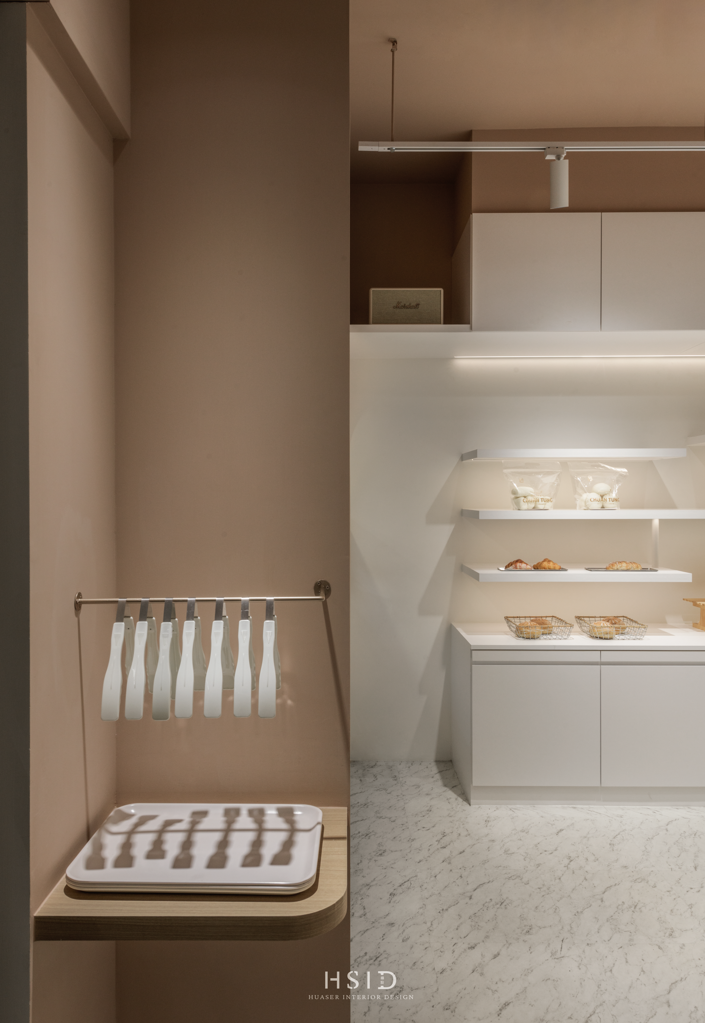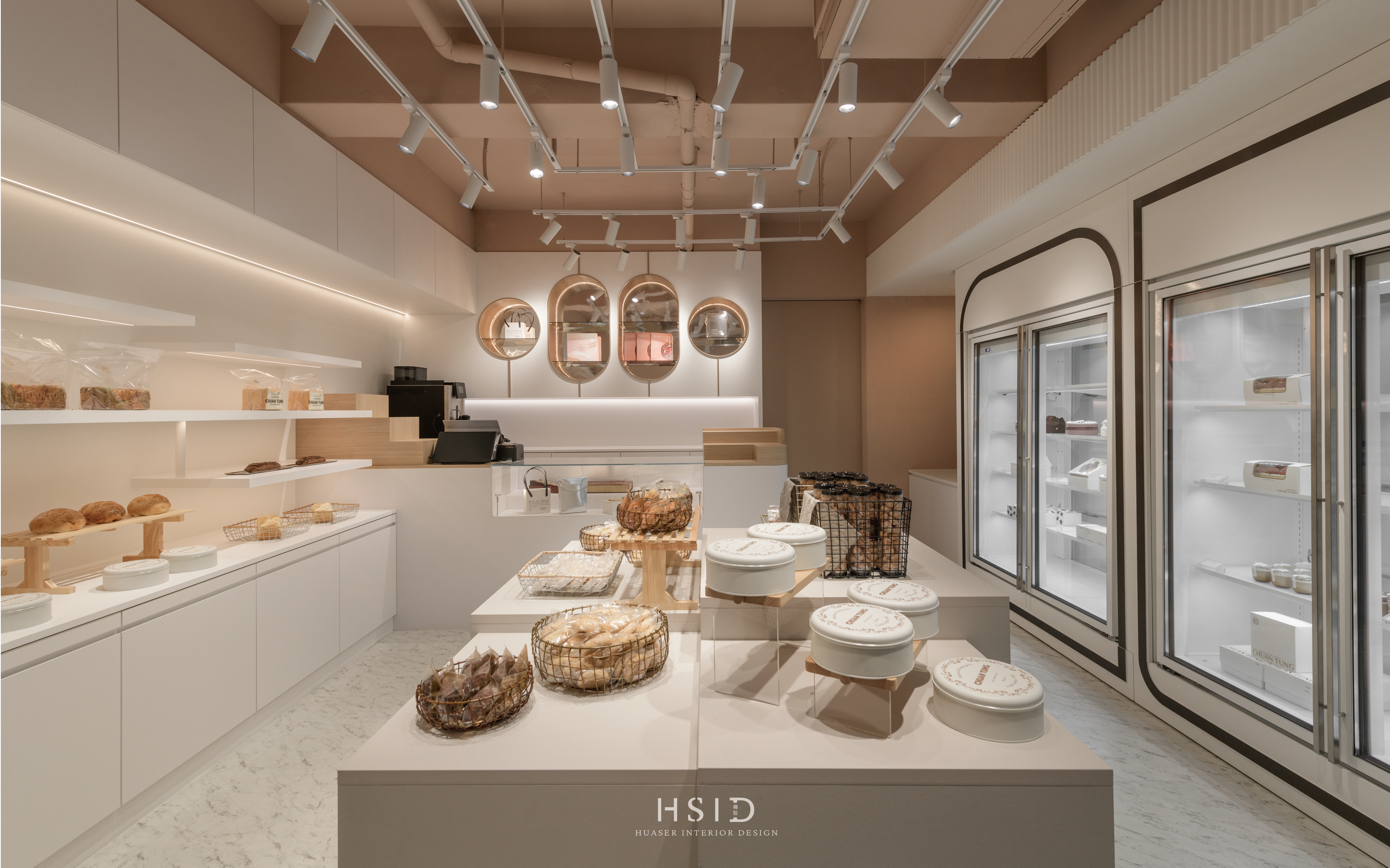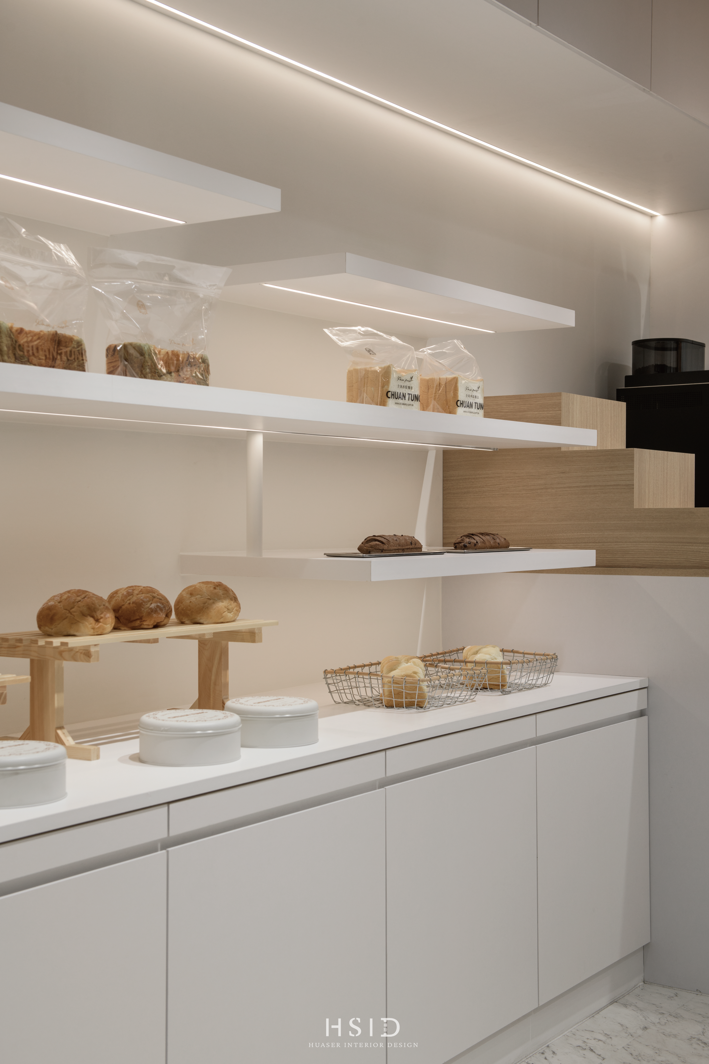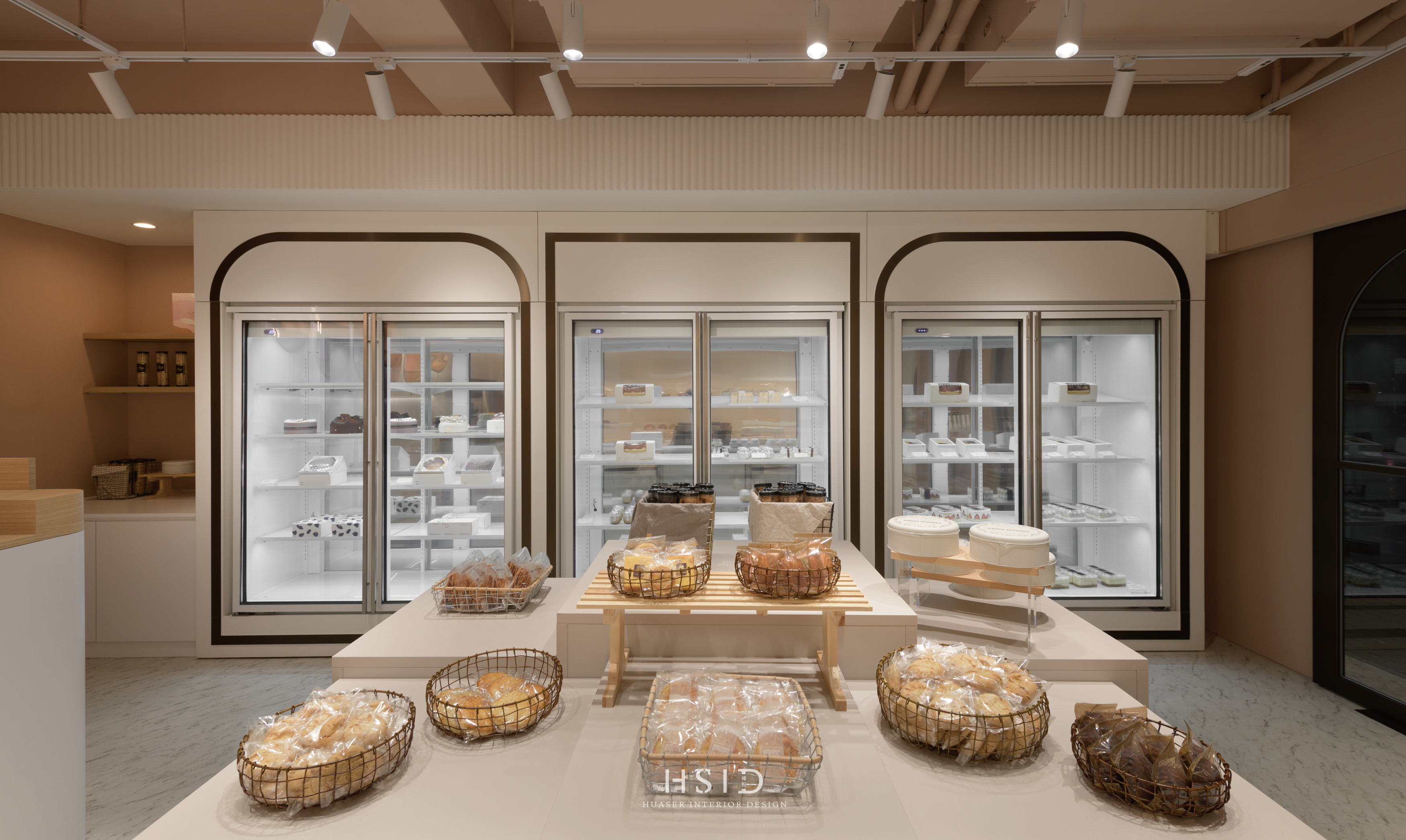店內空間主要以淺色調為主。營造出明亮氛圍,更能突顯每款甜點和麵包的手藝細緻和技術,讓它們更加顯眼和吸引人。