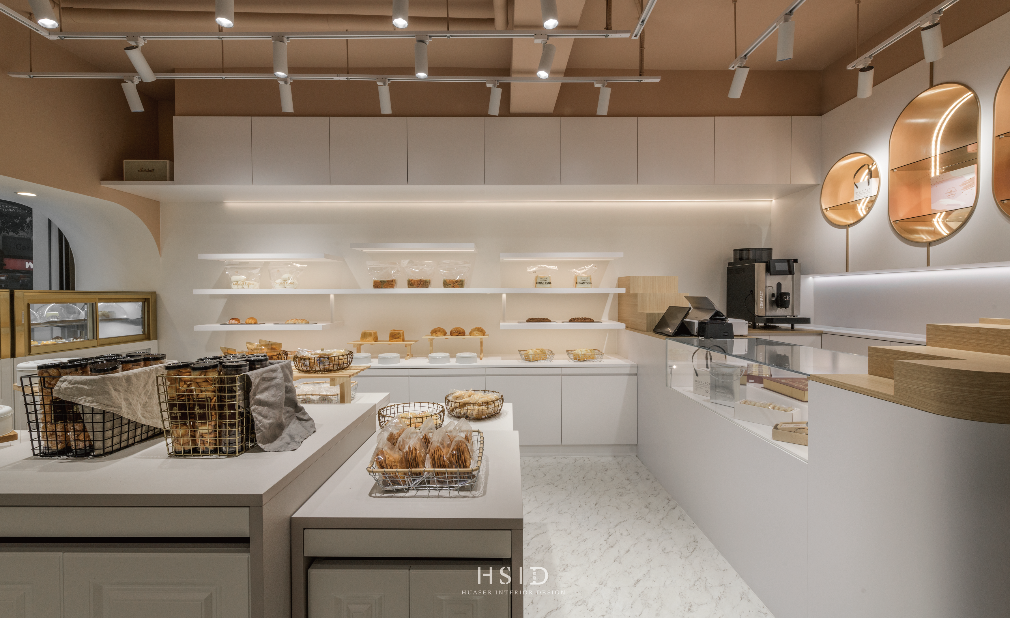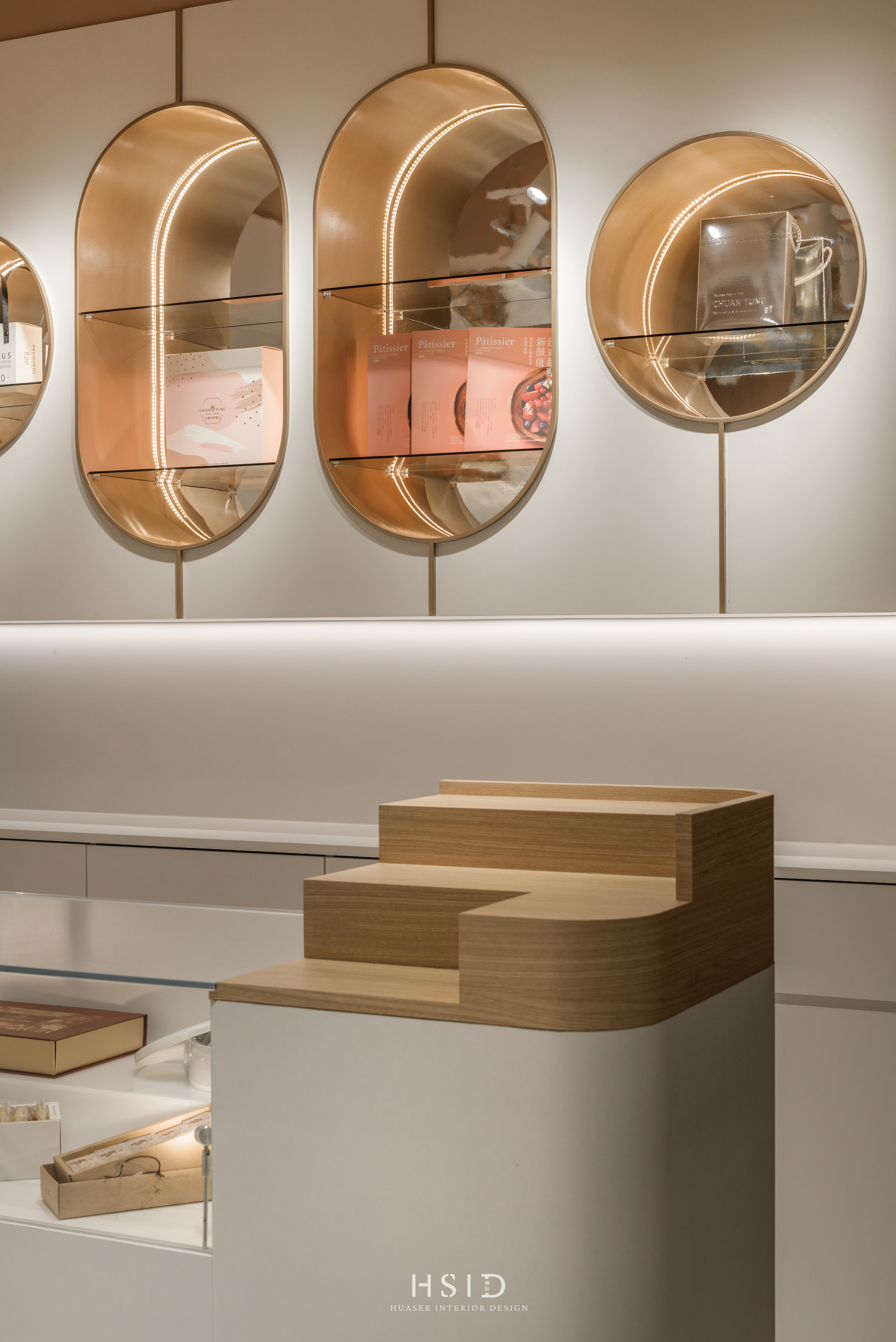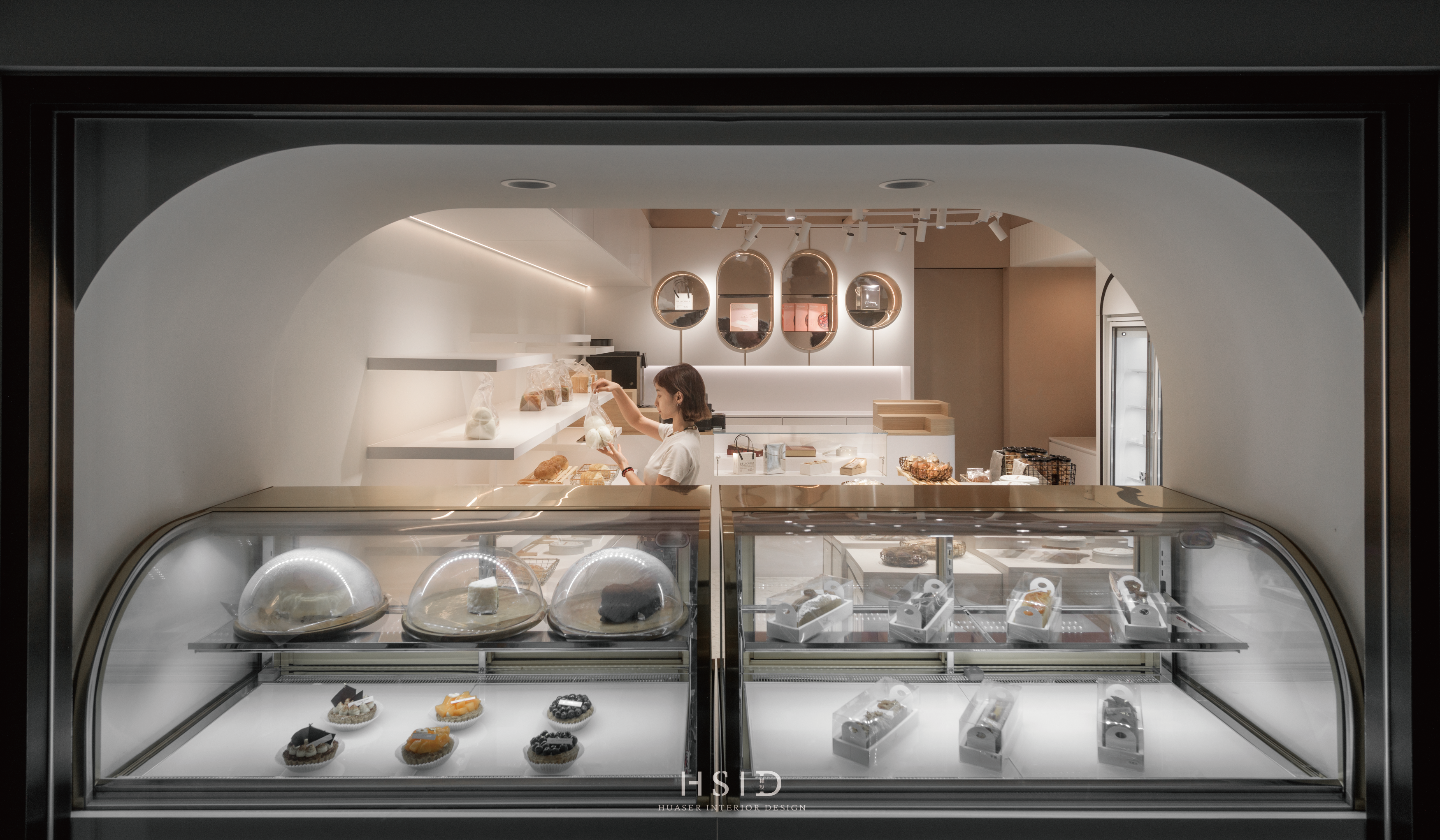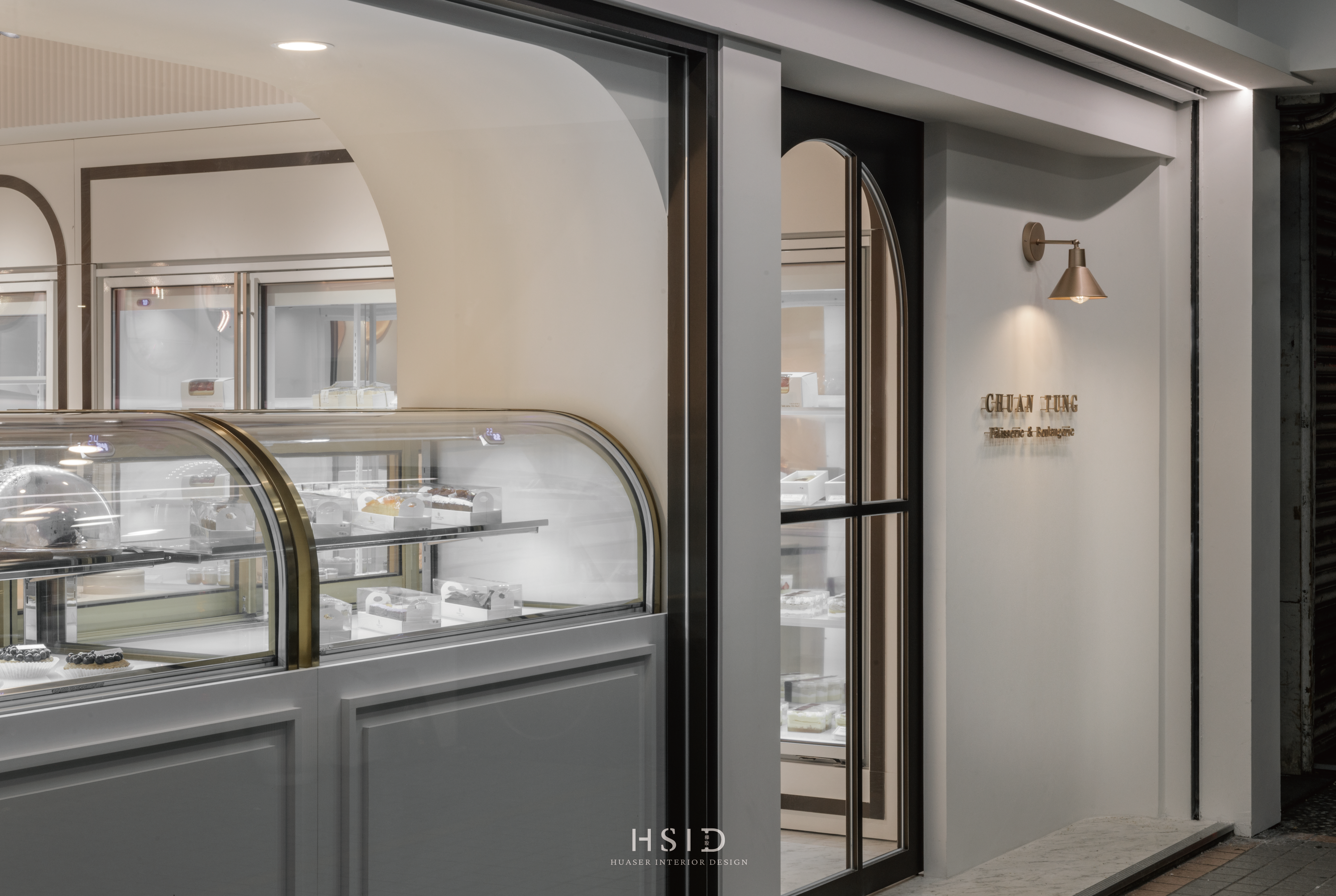 外觀方面,採用了圓弧框和拱形門的設計。特點是曲線形狀呈現出流暢和平滑的外觀,門旁的金屬燈具和雕刻字體相結合,整體展現法式氛圍感。並與內部深處的圓弧陳列架相呼應,形成深淺層次分明的視覺效果,使整個店面更加精緻優雅。