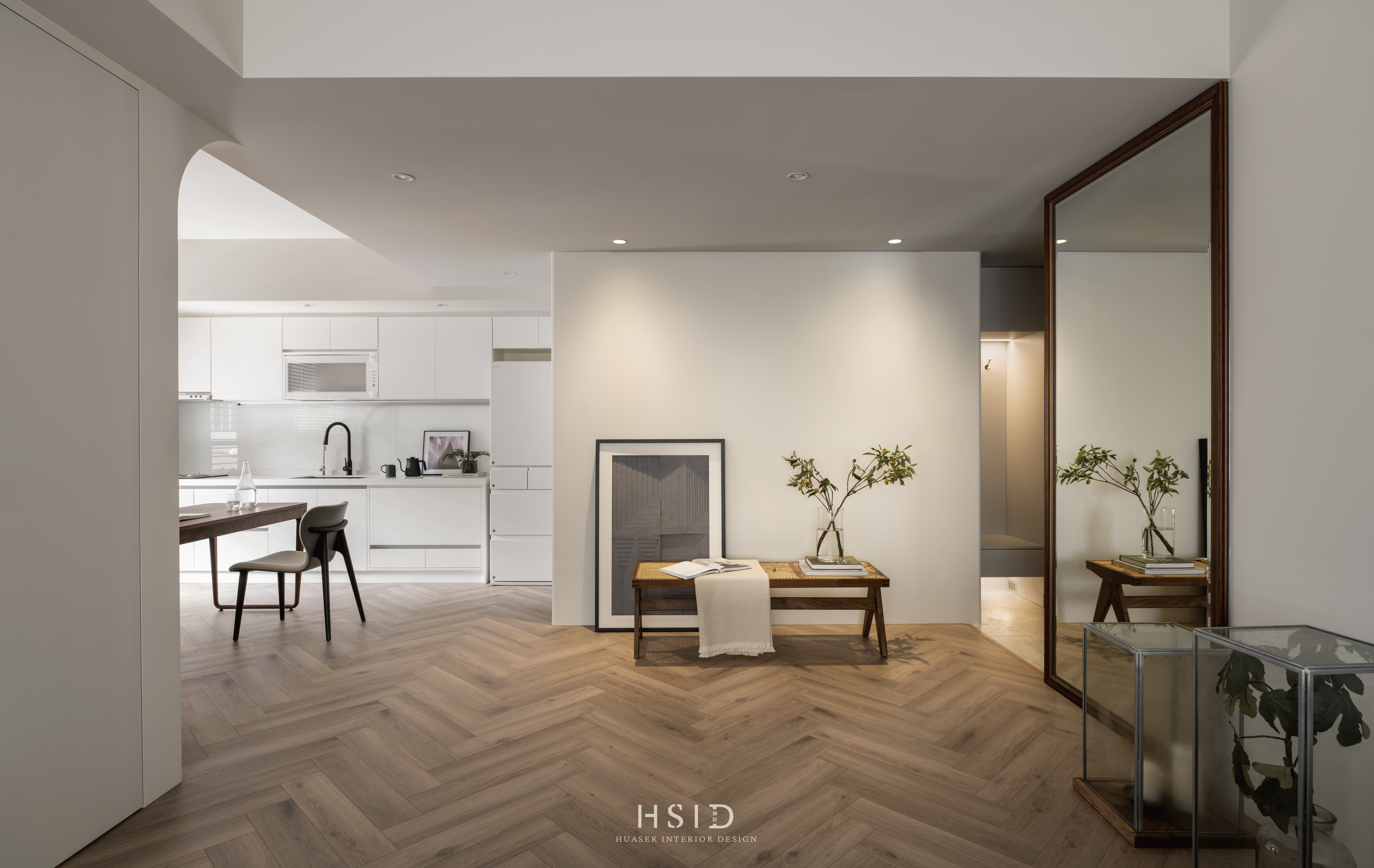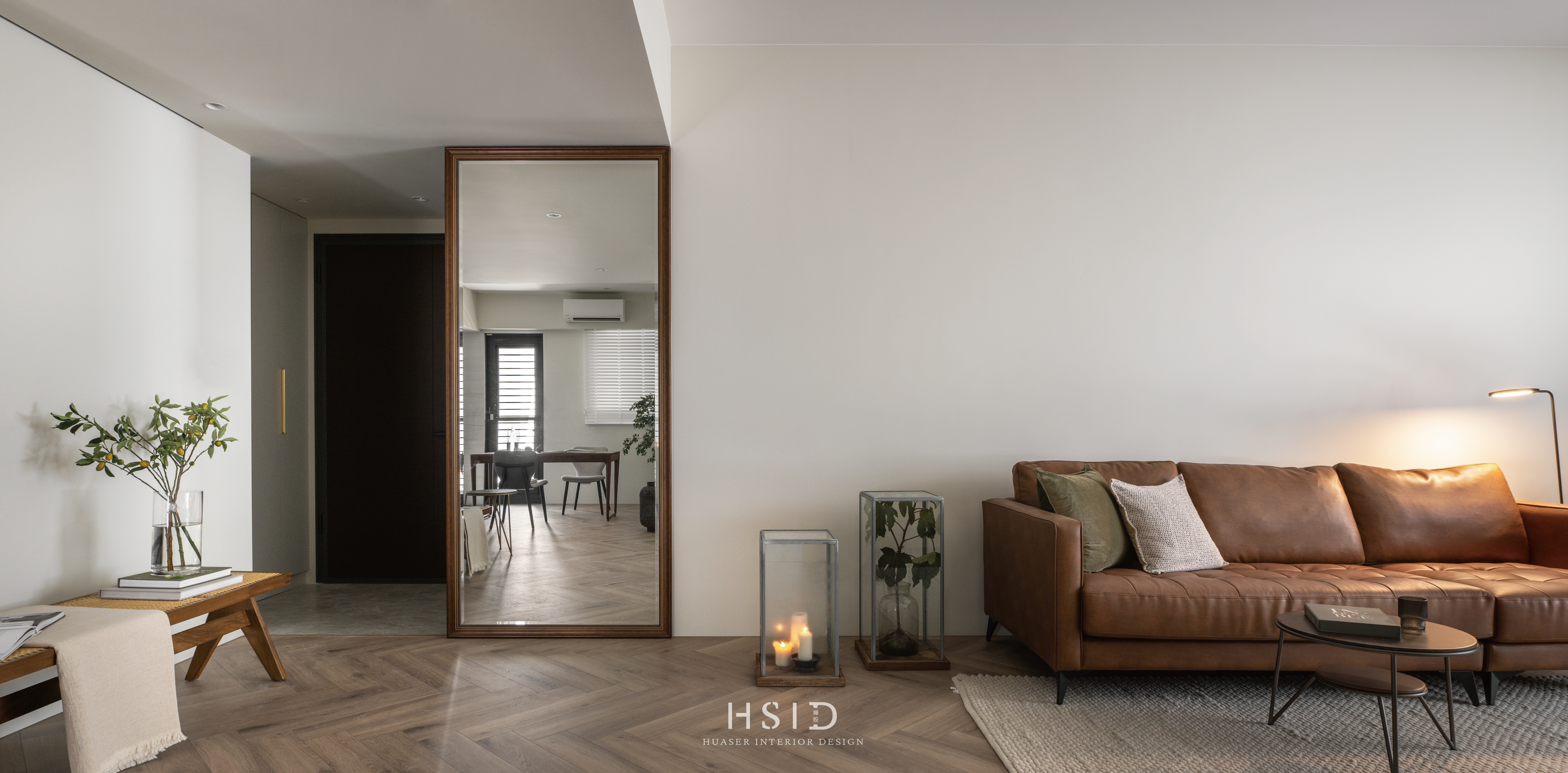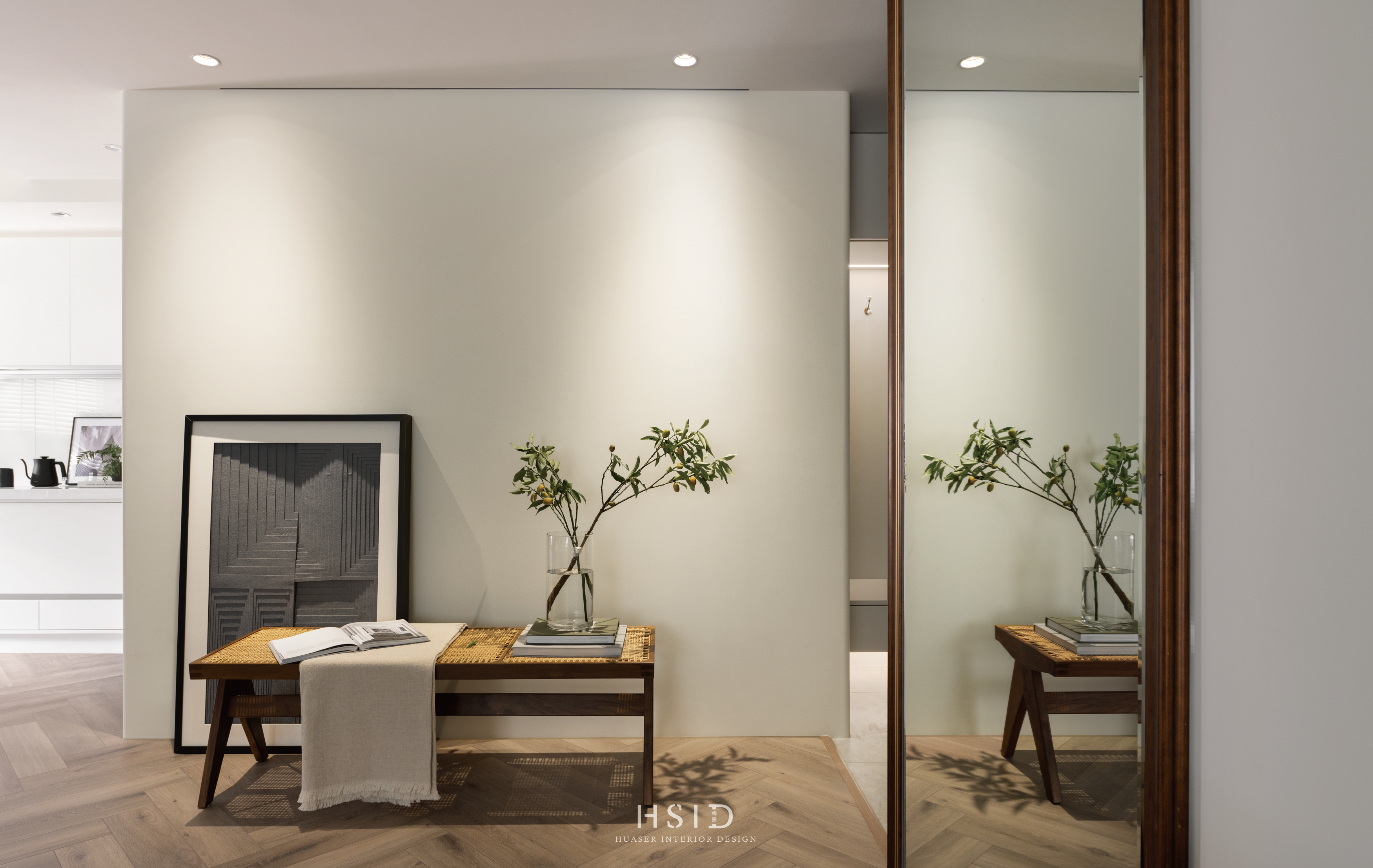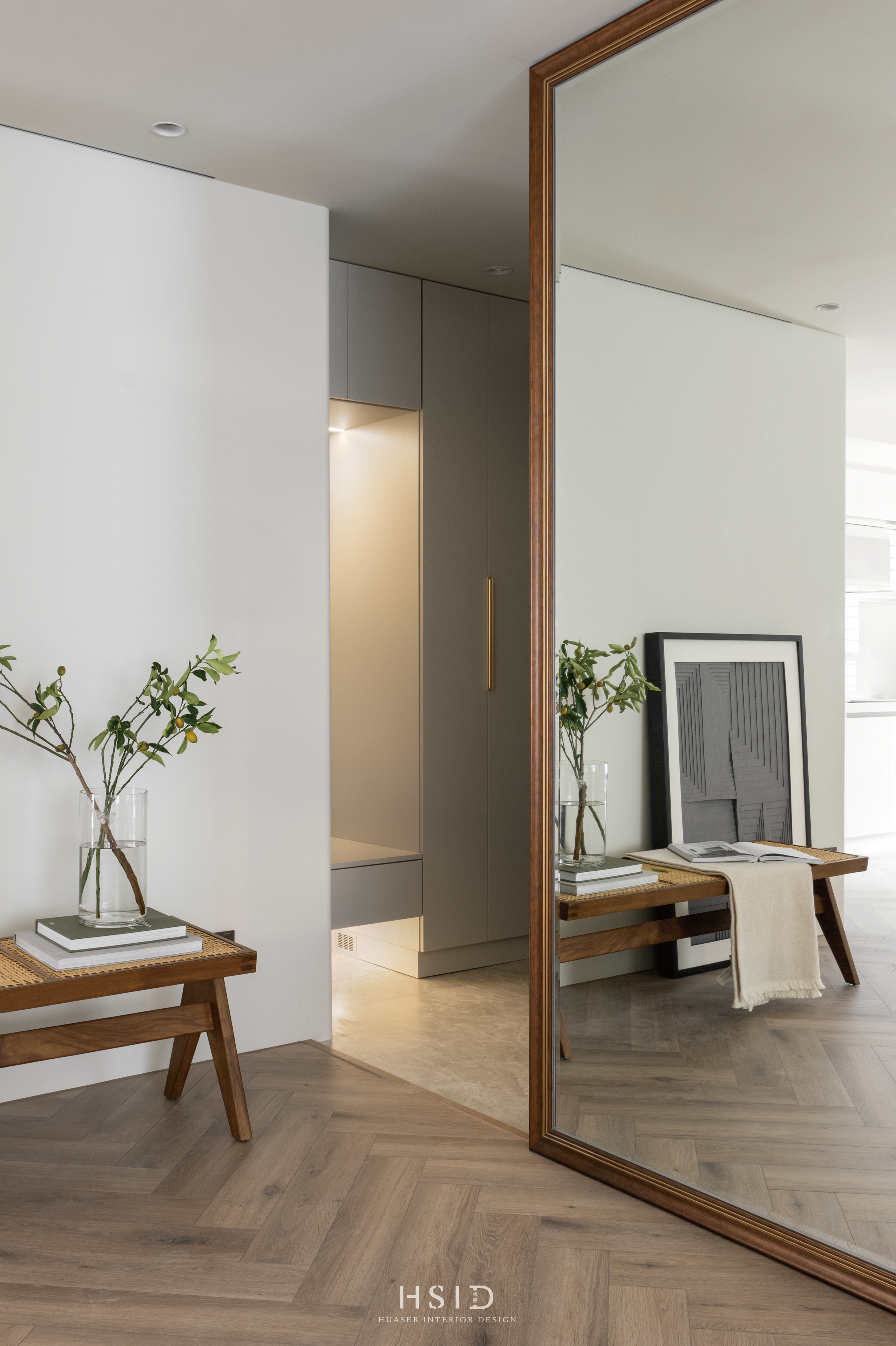 另外,特別規劃了一處端景區,以供未來擺放屋主喜愛的畫作或打造獨特的回憶牆,豐富了家居的藝術氛圍。同時,為滿足屋主的需求,特製了一面頂天立地鏡,不僅能夠滿足平日瑜珈需求,同時也具備了外出時的穿衣鏡功能,為生活增添了實用性和美感。屋主的用心與品味在每一處都得以體現,打造出一個充滿舒適和故事的家。