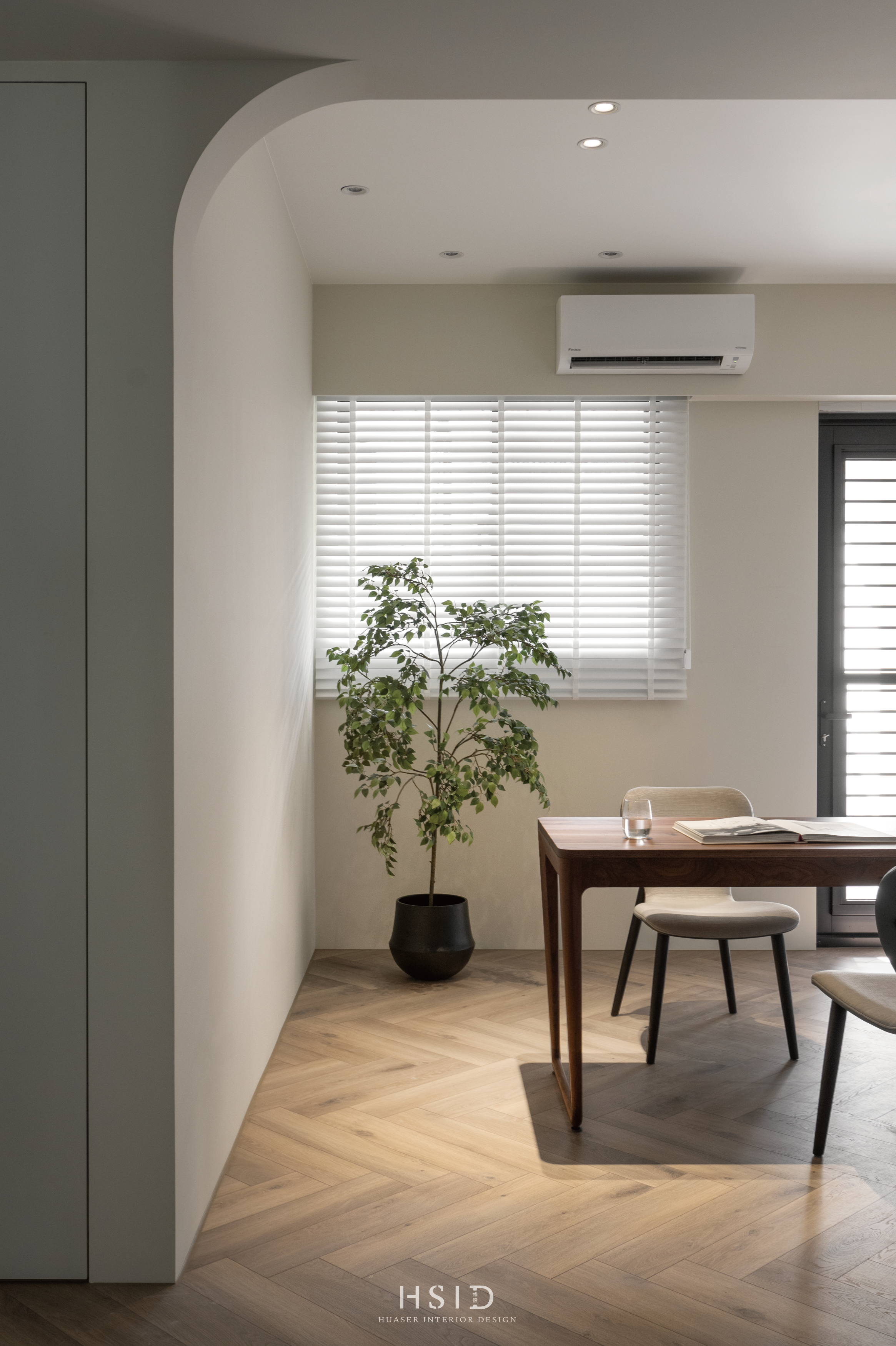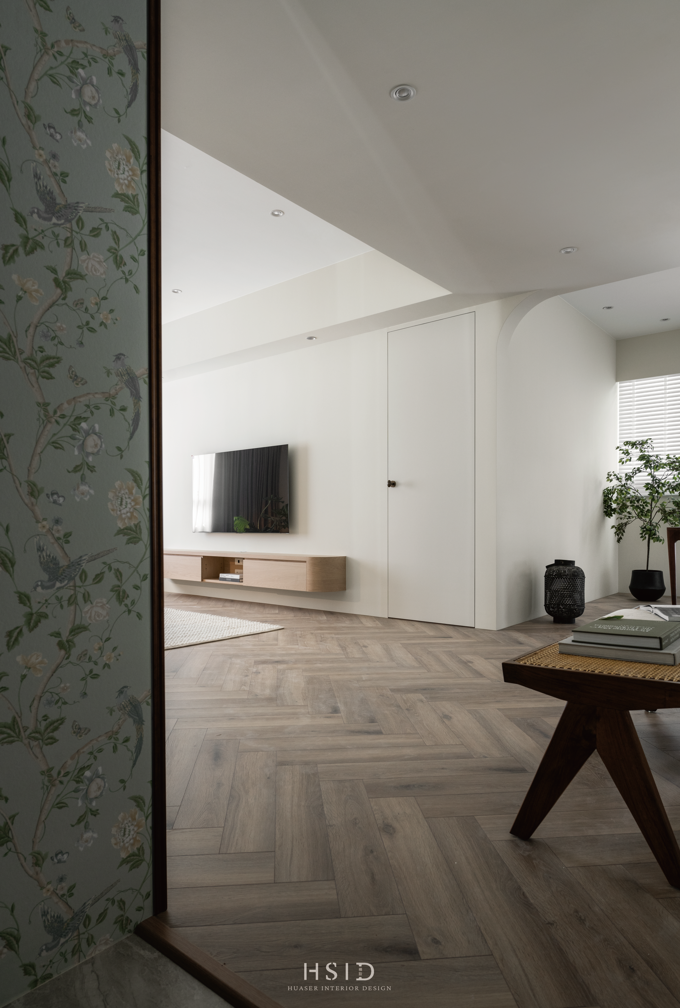 玄關處貼上了屋主喜愛的壁紙花樣,營造出有趣而不單調的氛圍。地板以人字拼方式交錯,呈現高品質的視覺效果,同時也為空間增色不少。天花及轉角處的圓弧面設計營造了流暢且溫潤的視覺感。在每一處五金的挑選上,像把手、龍頭、掛勾等都以古銅色系為主,賦予居室古典雅致的氛圍。