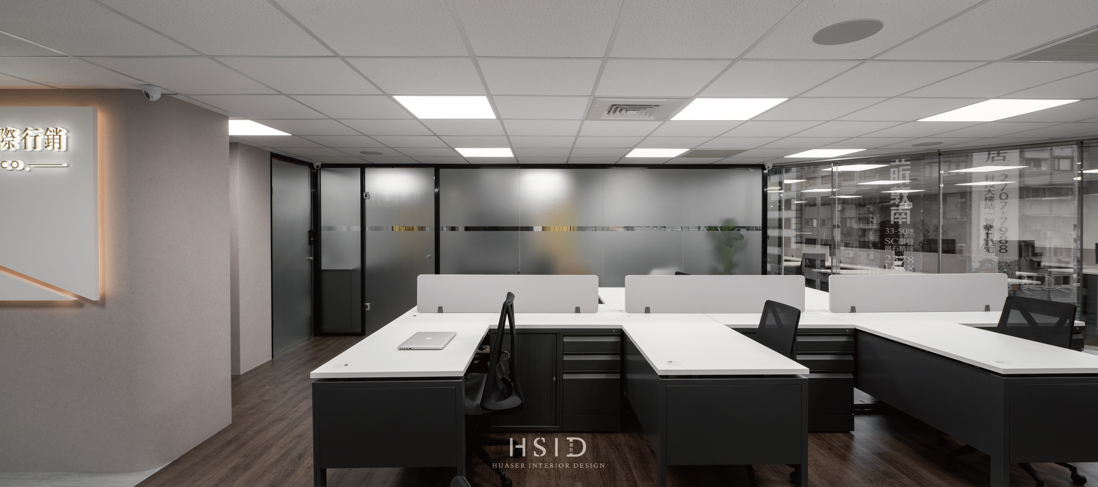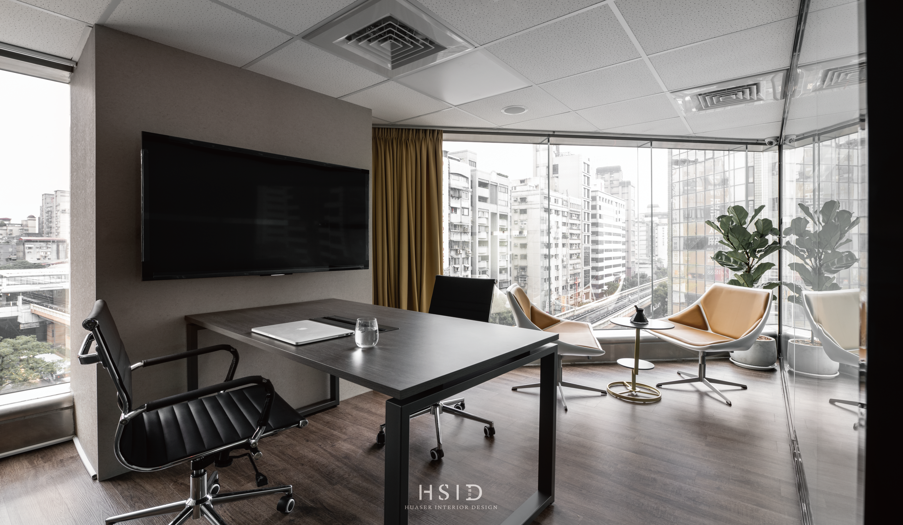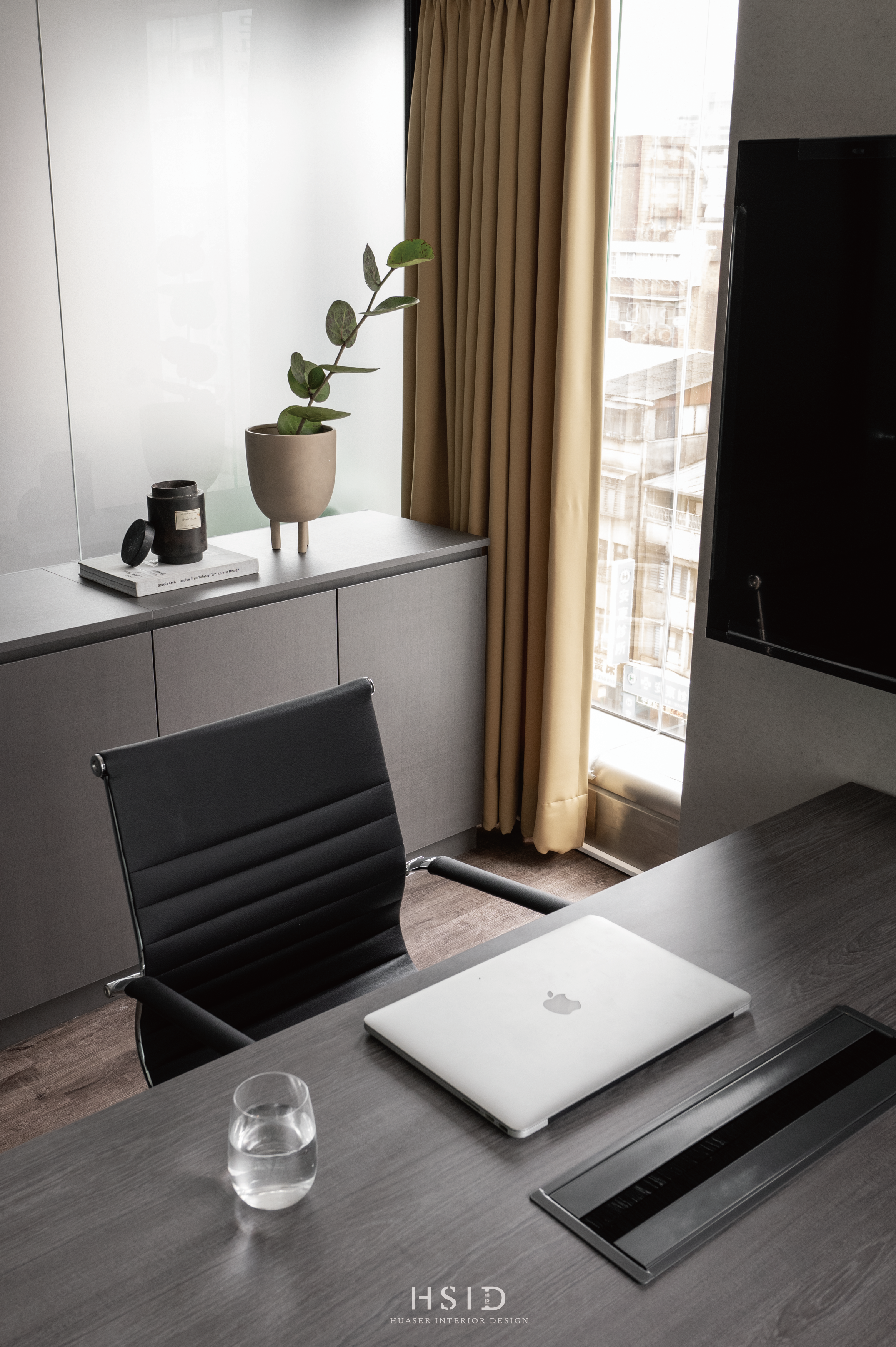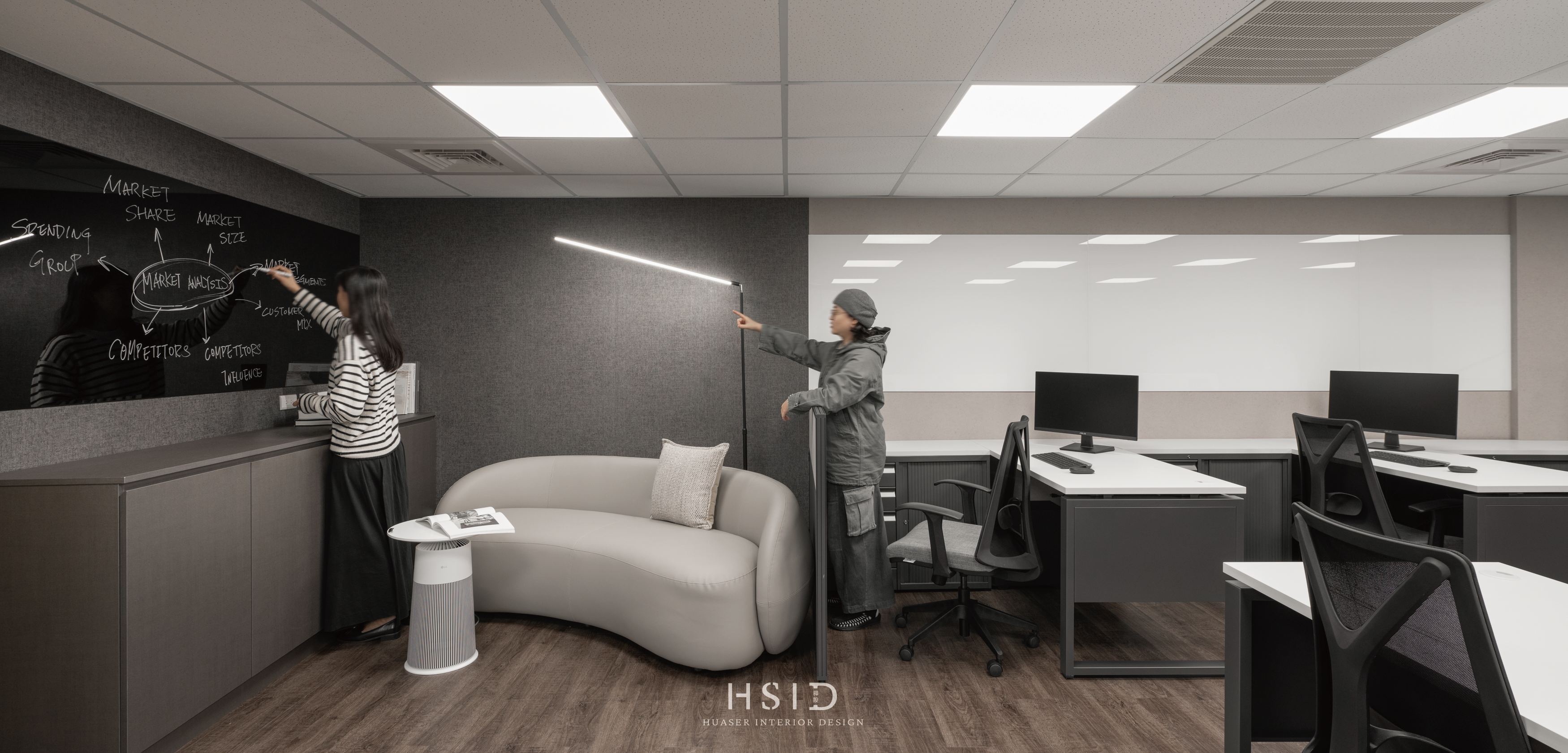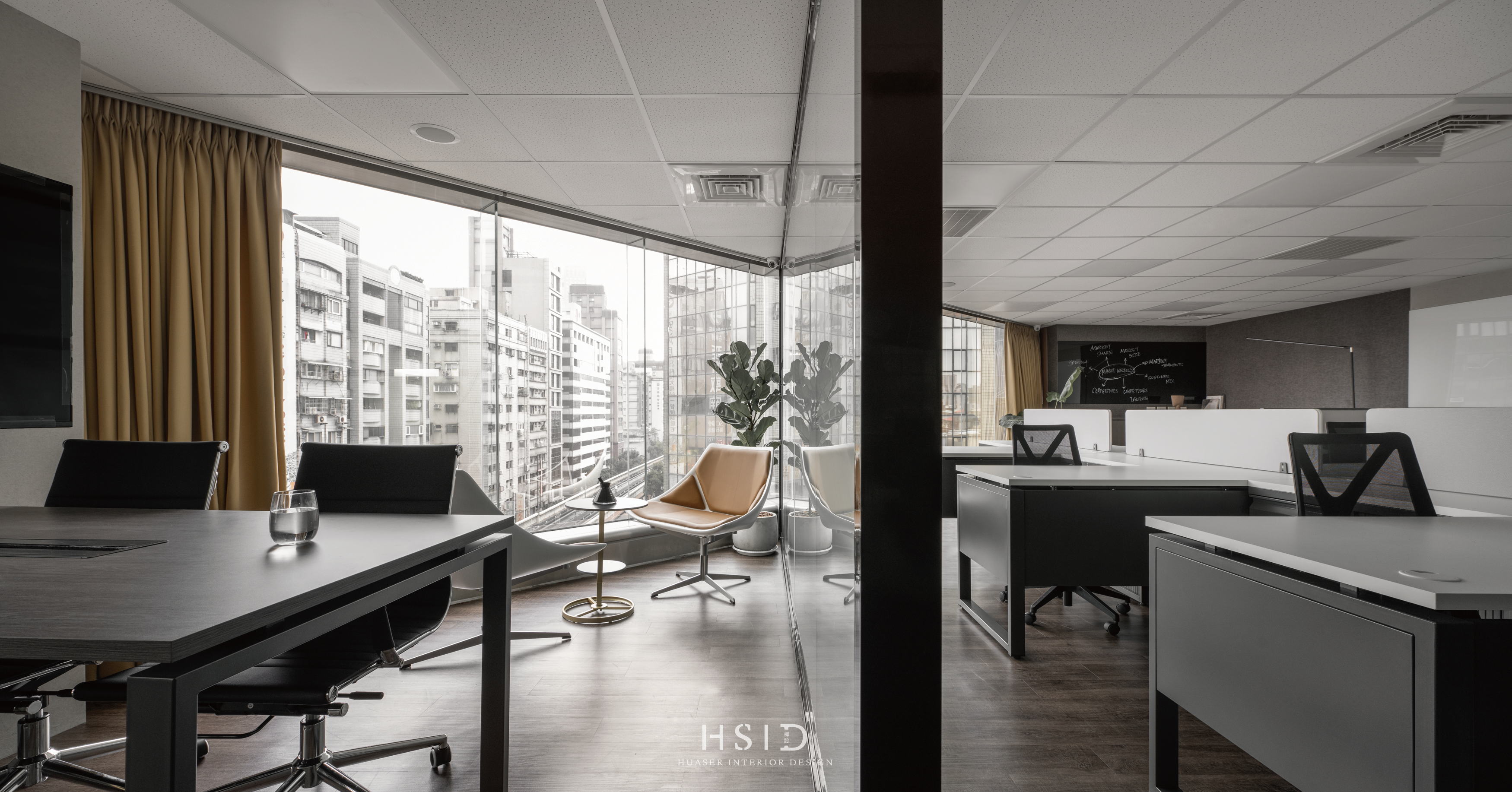 公共空間規劃8-10人配置,使每位同仁既感受到舒適,又能夠自由行走而不影響他人。牆面配製使用玻璃為當作小白板,方便討論事項的紀錄及目標執行用。後方的小休憩沙發區,不僅提供了員工休息放鬆的區域,也適合進行輕鬆的商務討論。會議區的特點是擁有大面積的落地窗,讓充足的自然光線灑落其中,營造了一個明亮開朗的氛圍。隔間運用強化毛玻璃製作為輕隔間,也能讓光線透進辦公區域,也達到會議中的隱私效果。