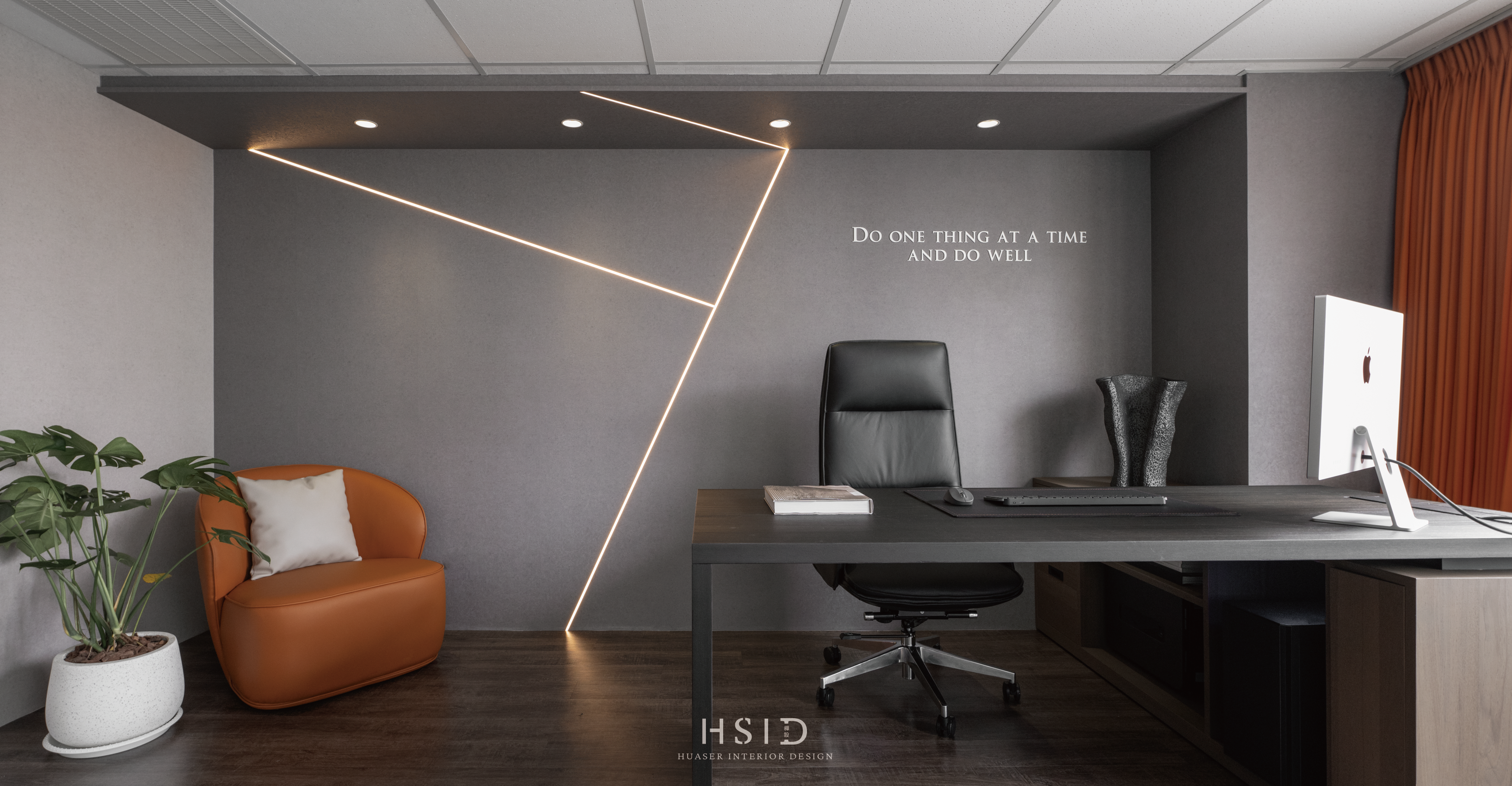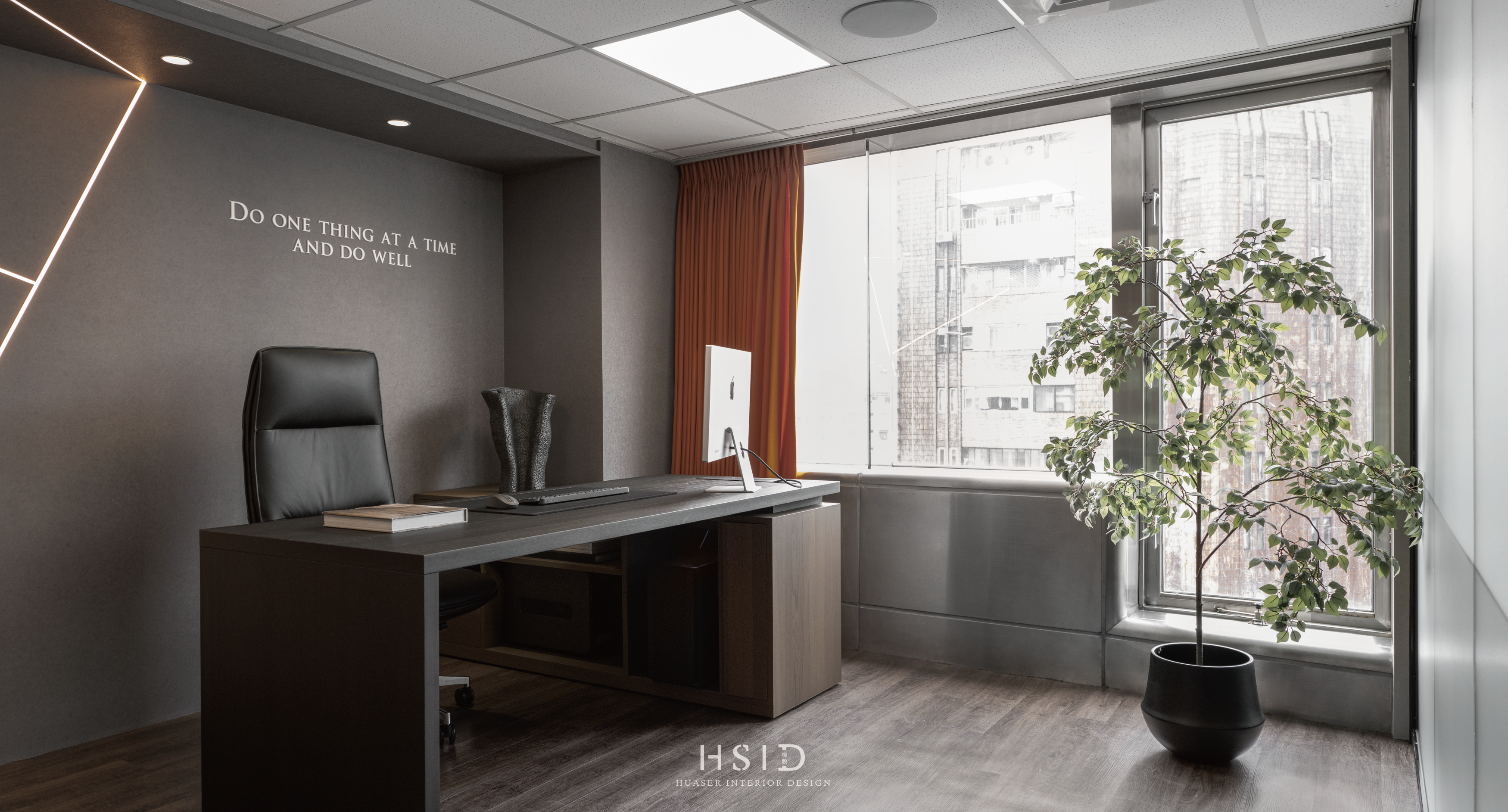 主管區運用深色系的大面積配置,內外色系相得益彰,營造出大氣沉穩氛圍。挑選的家具色彩更為整體空間注入了跳躍的視覺元素,賦予整個區域更為獨特的風采。而在後方的標語中,透露著對工作的堅持態度,呼應著專注、負責、並且追求卓越的價值觀。
